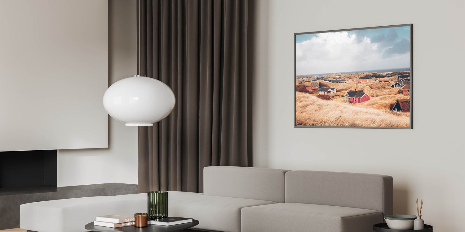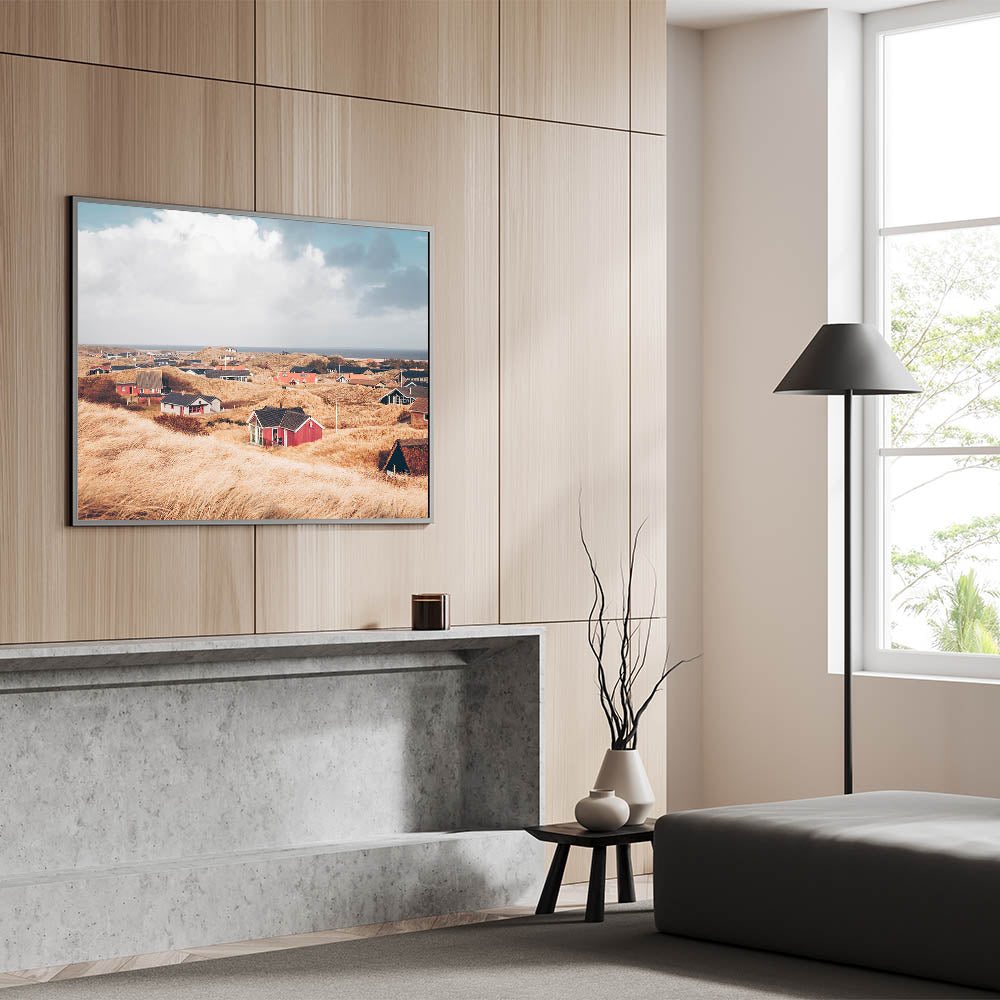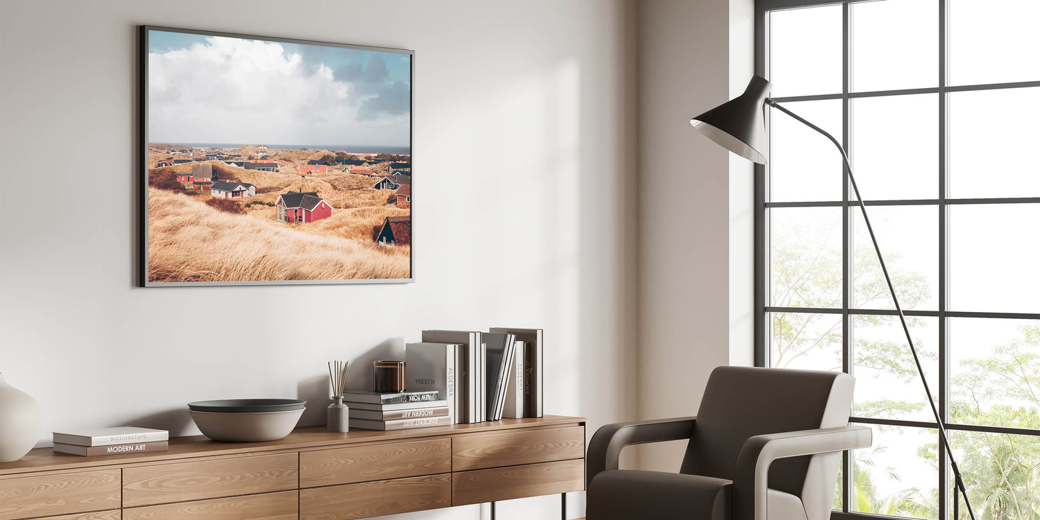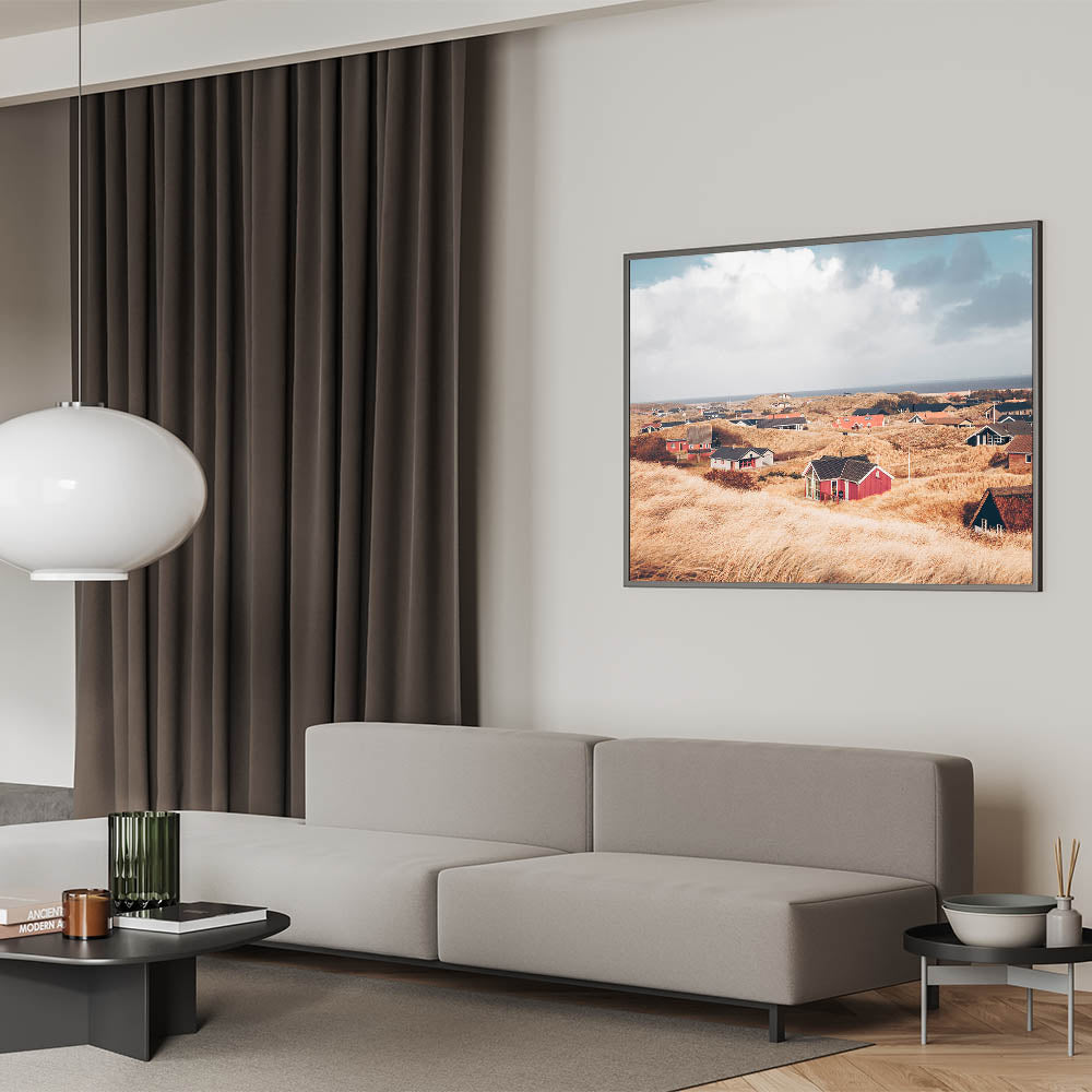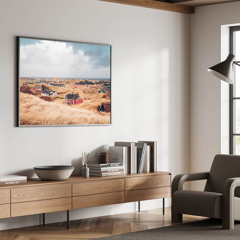 This picturesque Danish countryside canvas beautifully captures the charming rural landscape of Denmark. With quaint red-roofed houses set against a backdrop of golden dunes, this piece perfectly embodies the essence of Denmark photography. It is ideal for adding a touch of rustic charm to your Scandinavian decor while celebrating the serene beauty of Denmark’s coastal countryside.