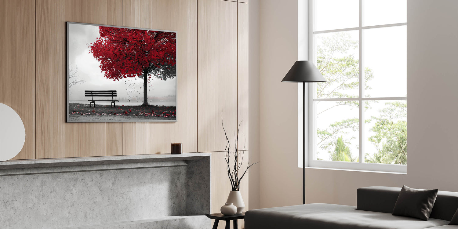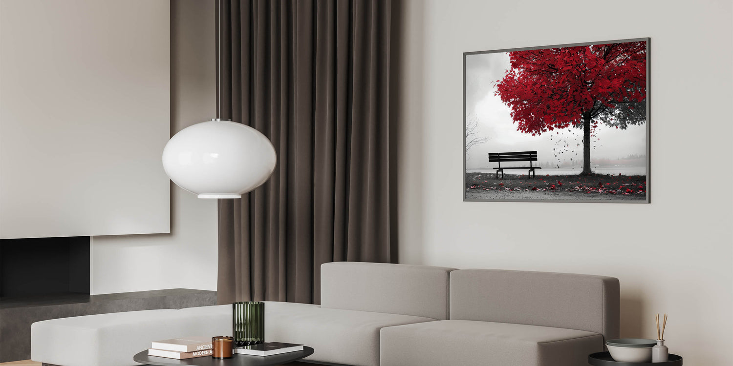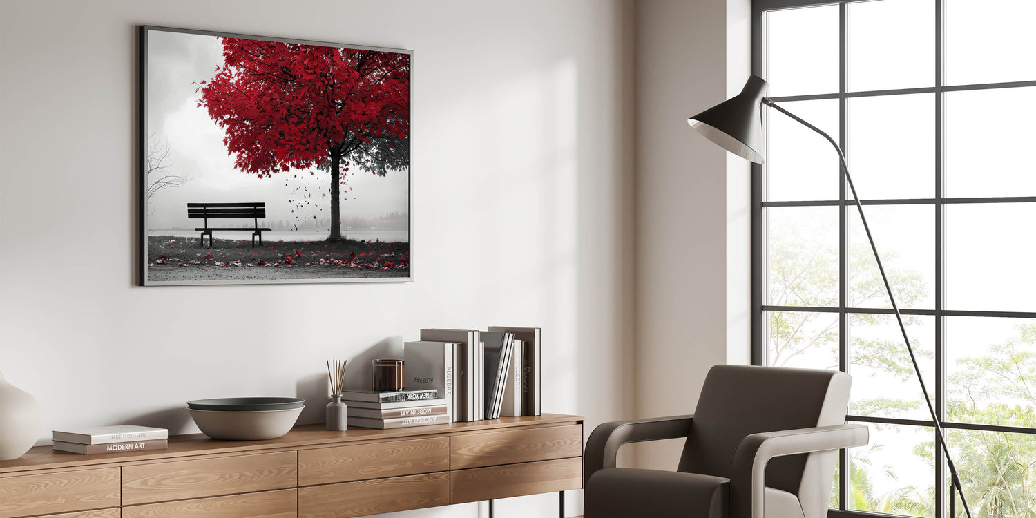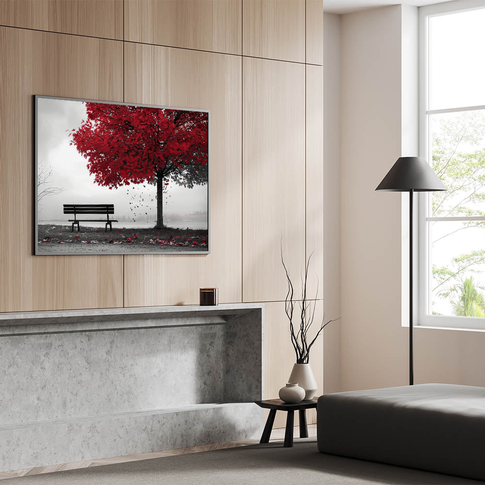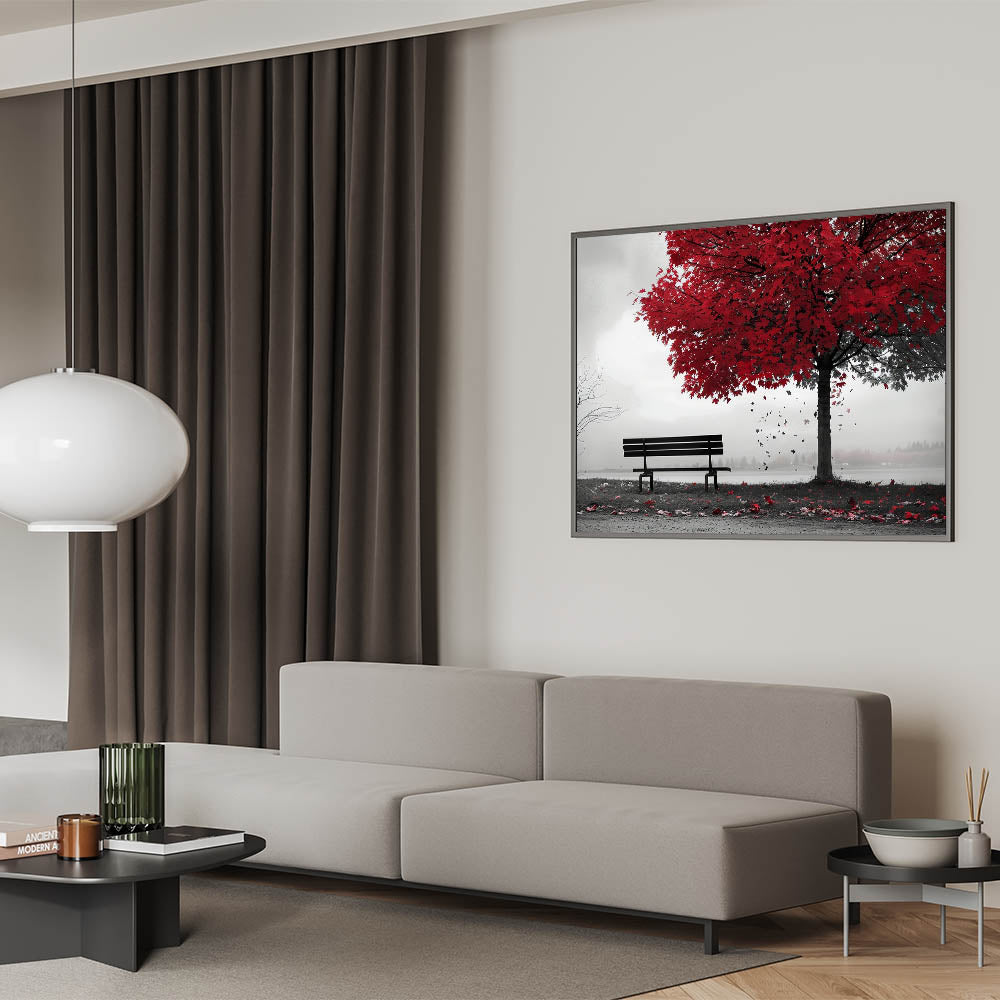Capture the peaceful beauty of a serene autumn day with this stunning artwork featuring a vibrant red tree shedding its leaves near an empty park bench. The striking contrast between the deep red foliage and the soft, neutral tones of the background creates a calming yet eye-catching piece that will add depth and character to any room. Perfect for those who appreciate minimalist, nature-inspired art.
