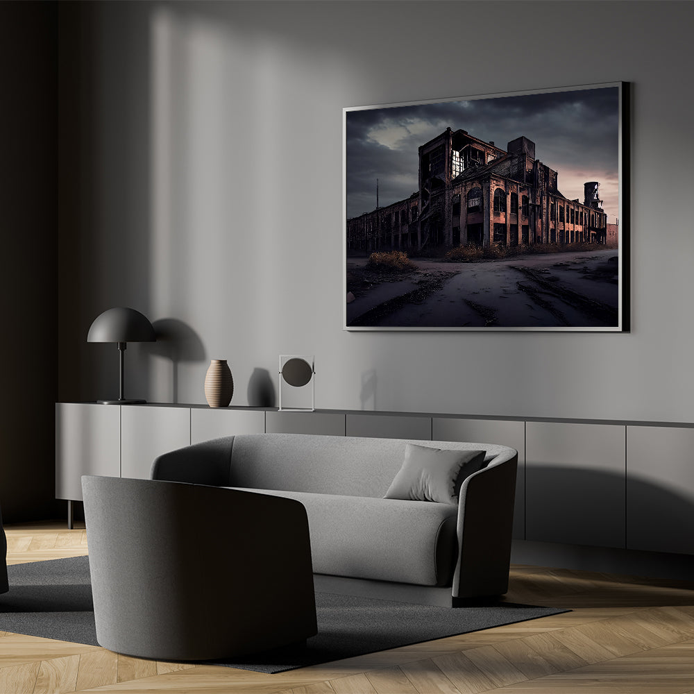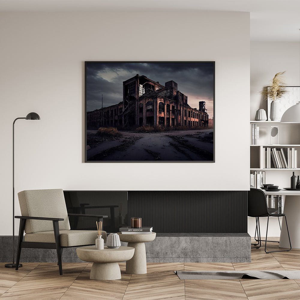 Capture the eerie beauty of abandoned industrial spaces with this evocative piece of dereliction wall art, featuring a decaying factory under a dark, foreboding sky. The crumbling walls, shattered windows, and overgrown surroundings tell a story of a place once full of life and activity, now left to decay and fade into history. This artwork perfectly embodies the haunting allure of urban decay, making it an ideal addition for those who appreciate the aesthetic of forgotten places.