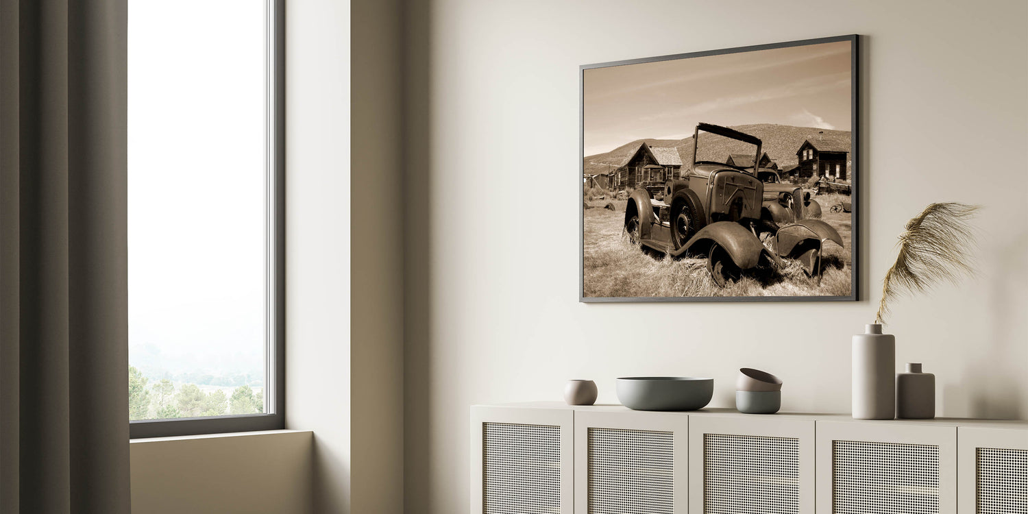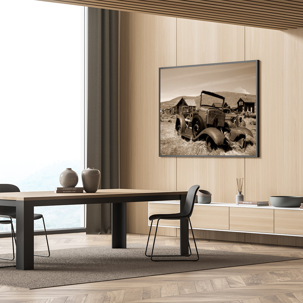 Capture the haunting beauty of time’s passage with this stunning piece of dereliction wall art, featuring abandoned vintage cars set against a backdrop of rustic, decaying buildings. The sepia tones enhance the nostalgic feel, evoking a sense of a forgotten era where these relics once thrived. This artwork is perfect for those who appreciate the beauty in decay and the stories these abandoned places tell.