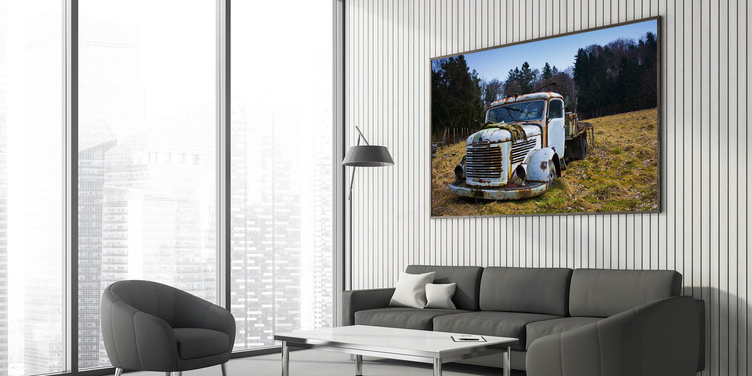 • High-quality print ensures sharp details and vibrant colors that bring out the textures of the rusting truck and its surroundings.