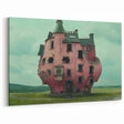 Step into a world of surreal architecture with this unique wall art featuring an abandoned pink house that defies conventional design. The unusual shape and cracked façade of the building create a striking visual that blends elements of fantasy with the haunting beauty of decay. Set against a vast, empty landscape, this piece captures the eerie yet captivating allure of forgotten places. Perfect for those who appreciate art that challenges the norm and evokes a sense of wonder and mystery.