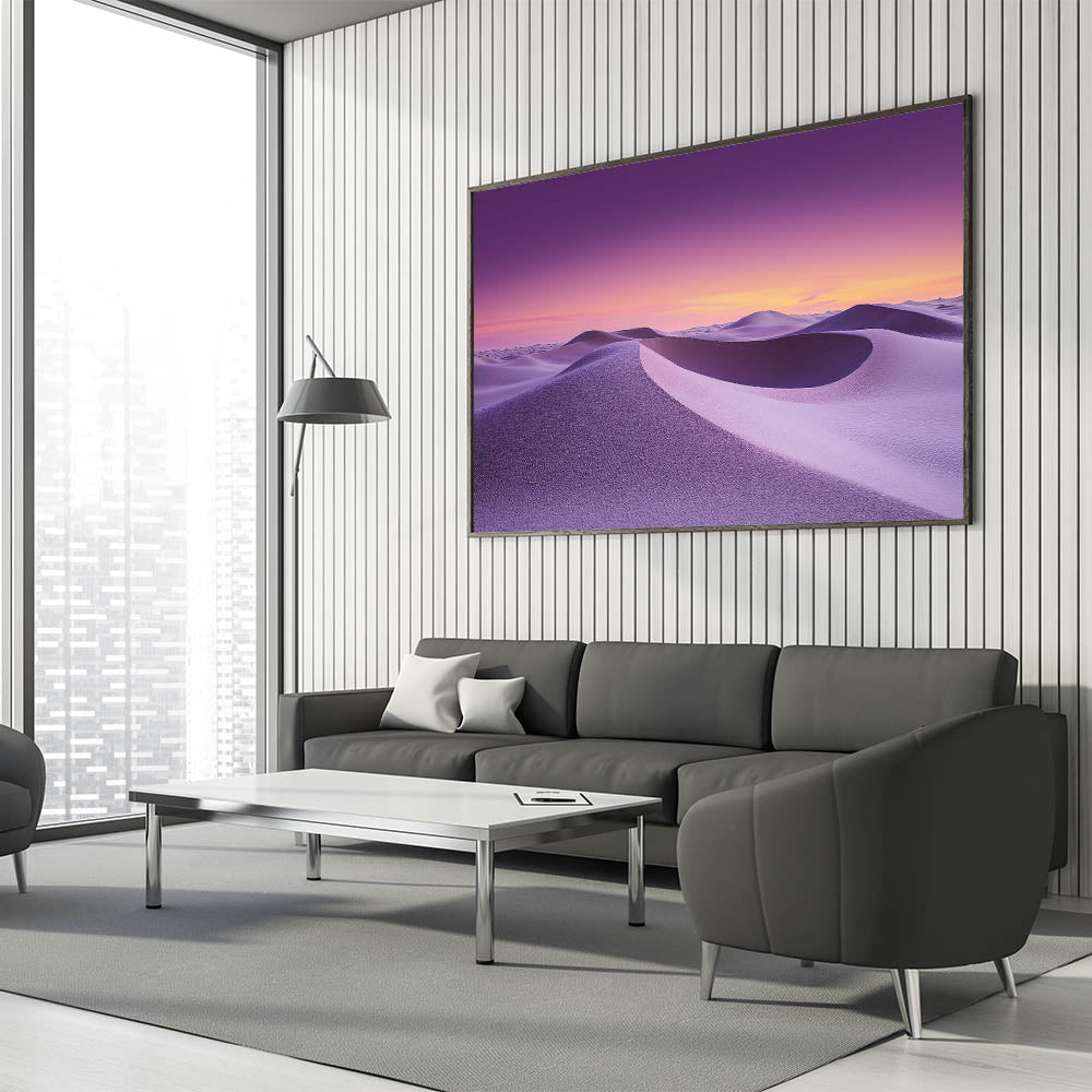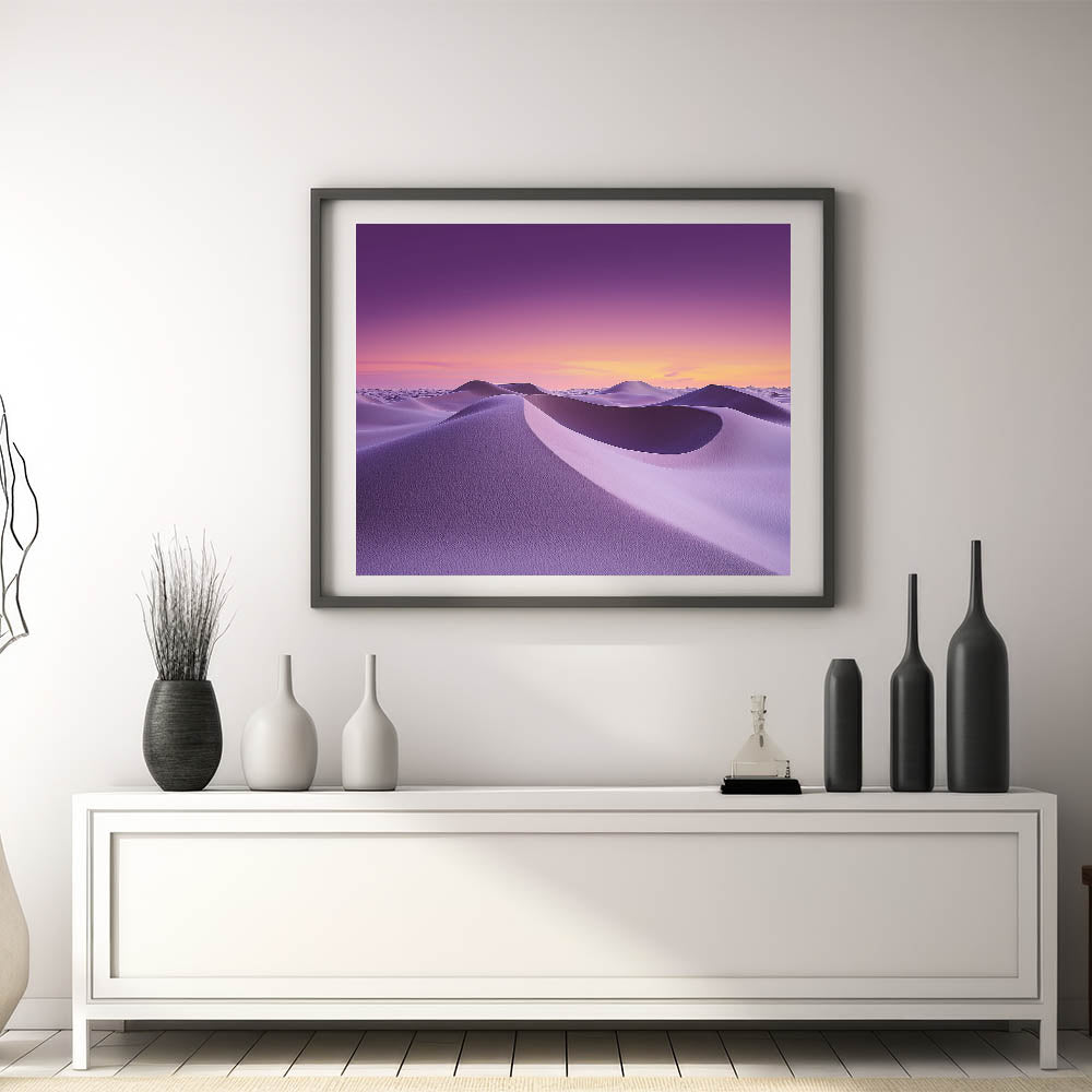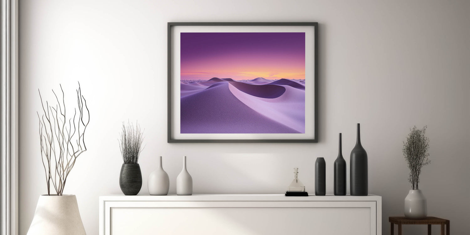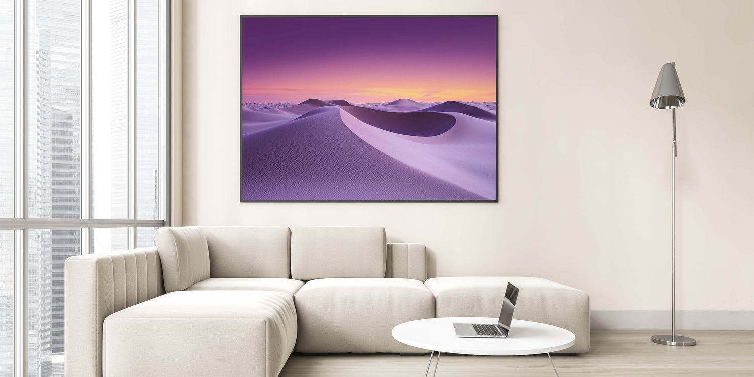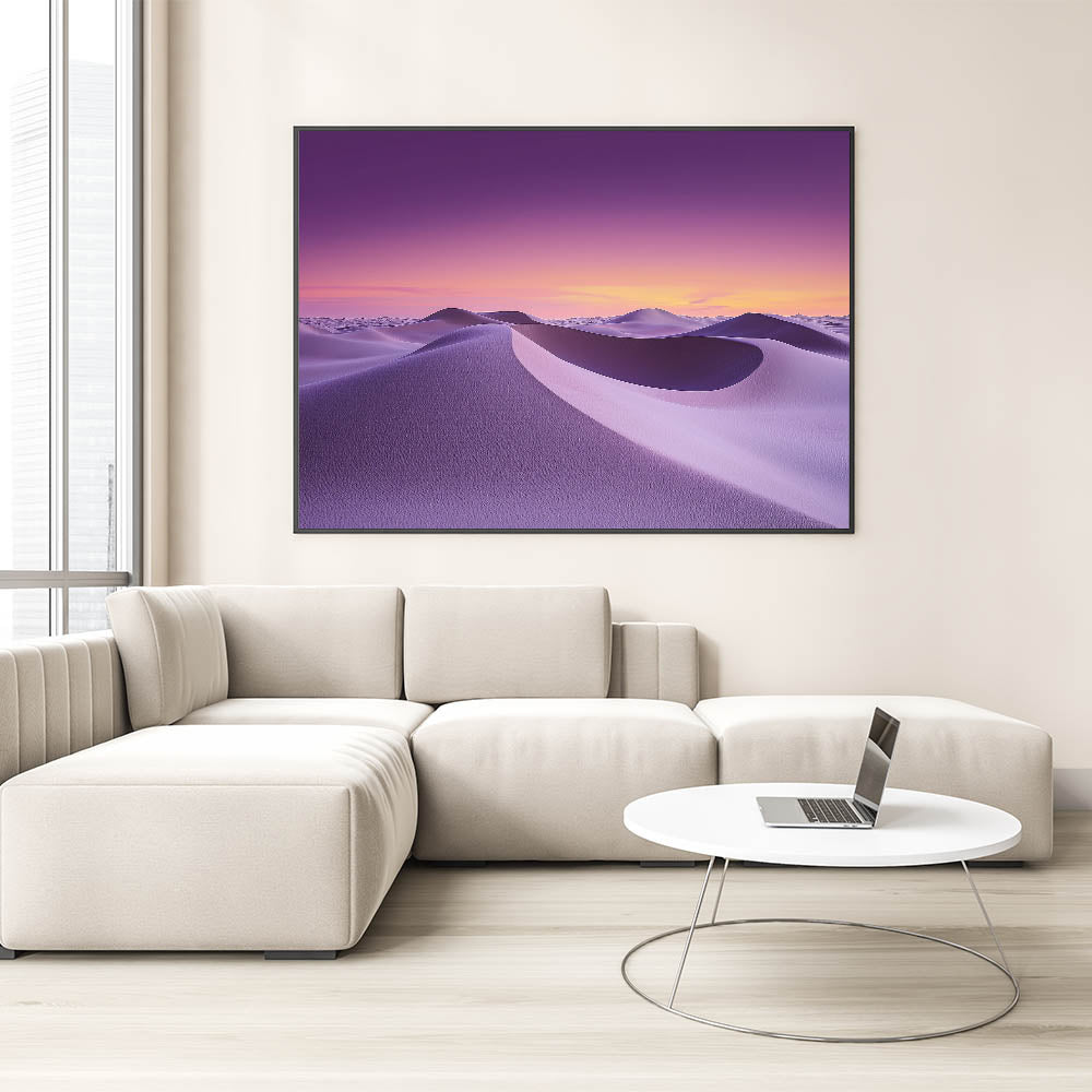 Immerse yourself in the tranquil beauty of this desert wall art, showcasing soft, undulating purple dunes bathed in the golden glow of a serene sunset. The seamless blend of lavender and warm peach hues creates a peaceful and dreamy ambiance, perfect for modern and minimalist interiors.