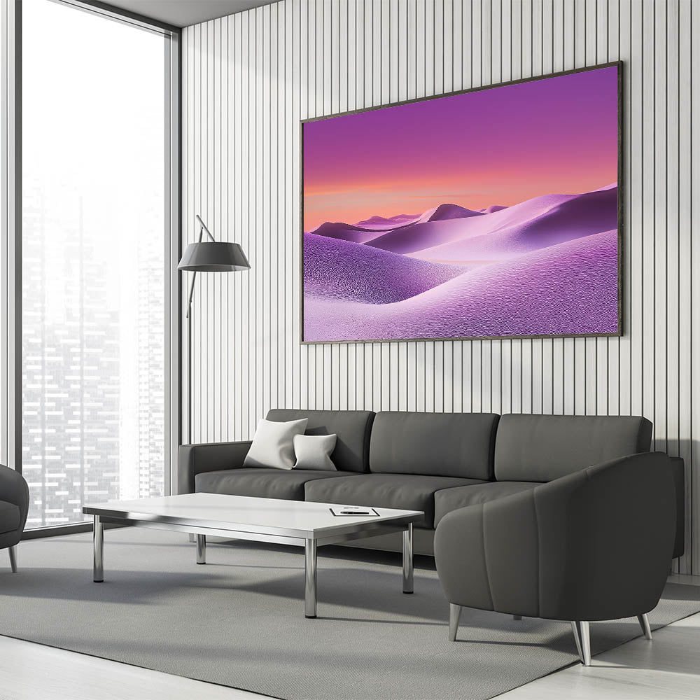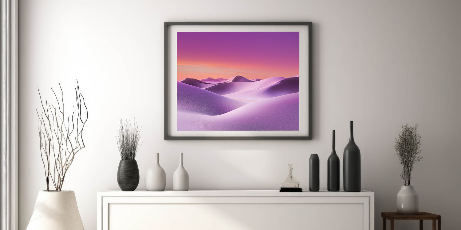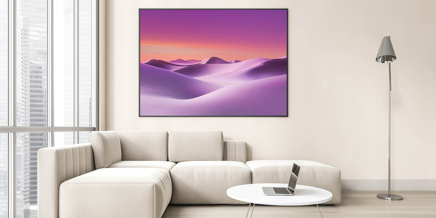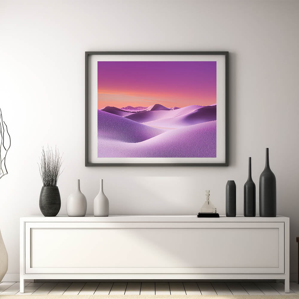 Embrace the serene elegance of this desert wall art, featuring rolling lavender dunes illuminated by a soft and warm sunset glow. The captivating blend of pastel hues creates a tranquil and dreamlike ambiance, perfect for elevating any space.