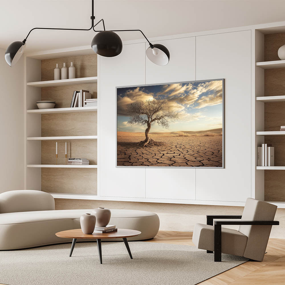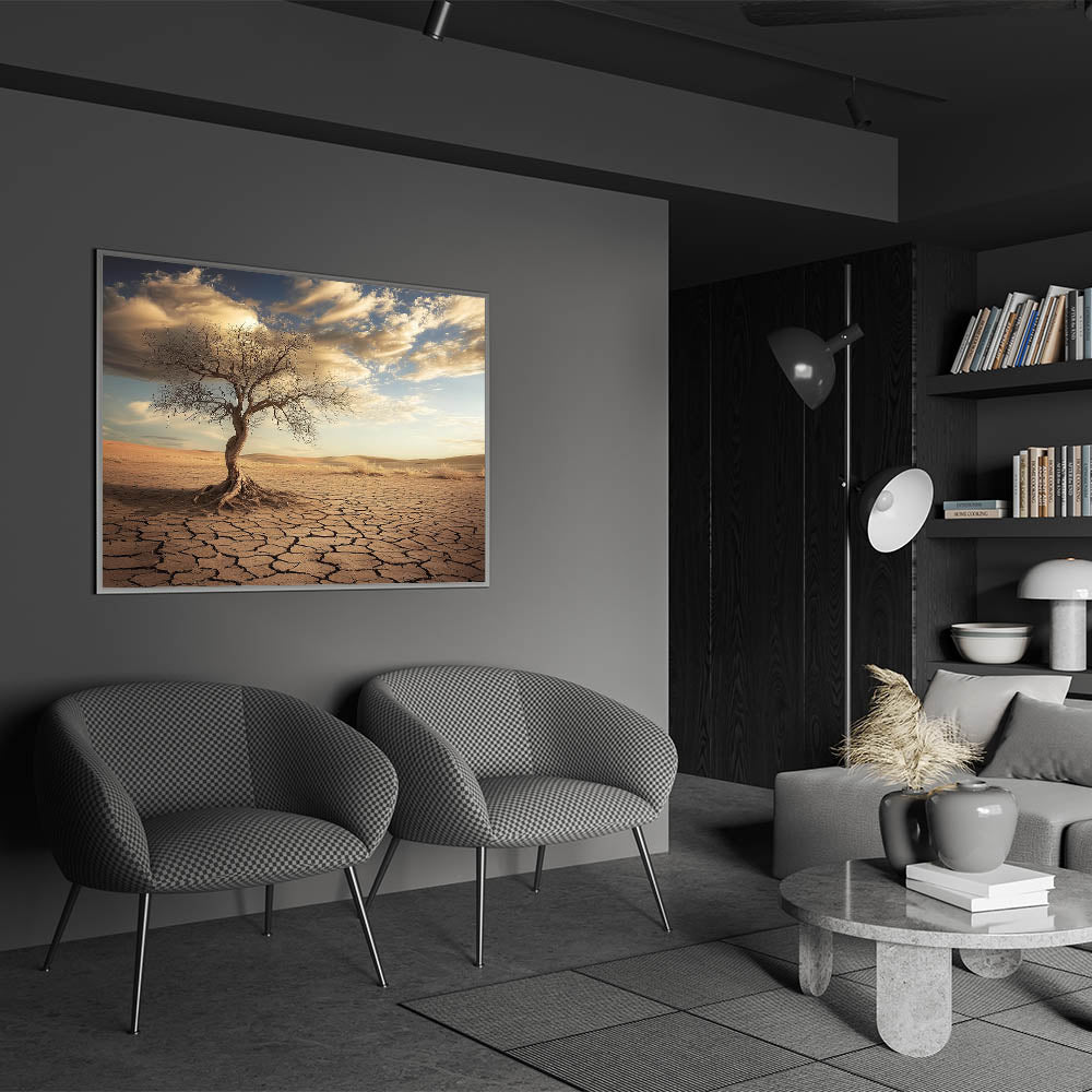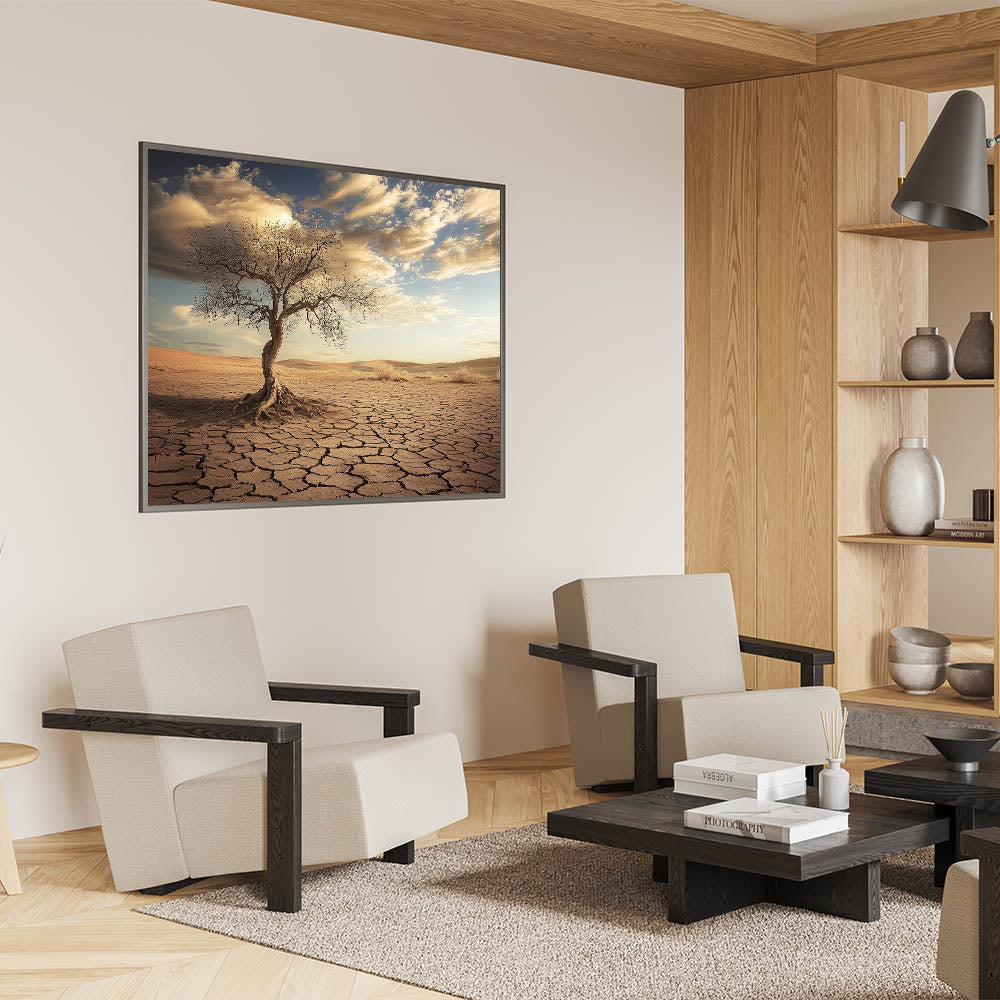 Capture the raw beauty of nature with this striking desert wall art, featuring a solitary twisted tree standing against a backdrop of cracked earth and golden dunes. The intricate details of the tree and the sunlit desert landscape create a dramatic and evocative piece of art.