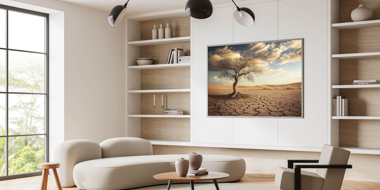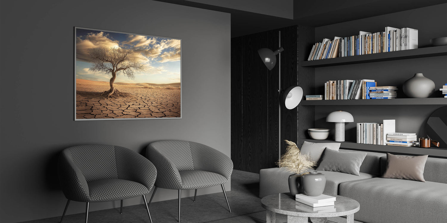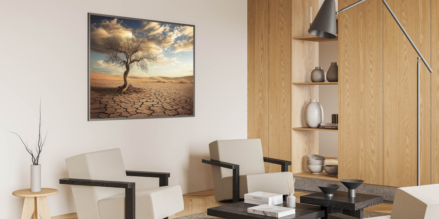 Capture the raw beauty of nature with this striking desert wall art, featuring a solitary twisted tree standing against a backdrop of cracked earth and golden dunes. The intricate details of the tree and the sunlit desert landscape create a dramatic and evocative piece of art.