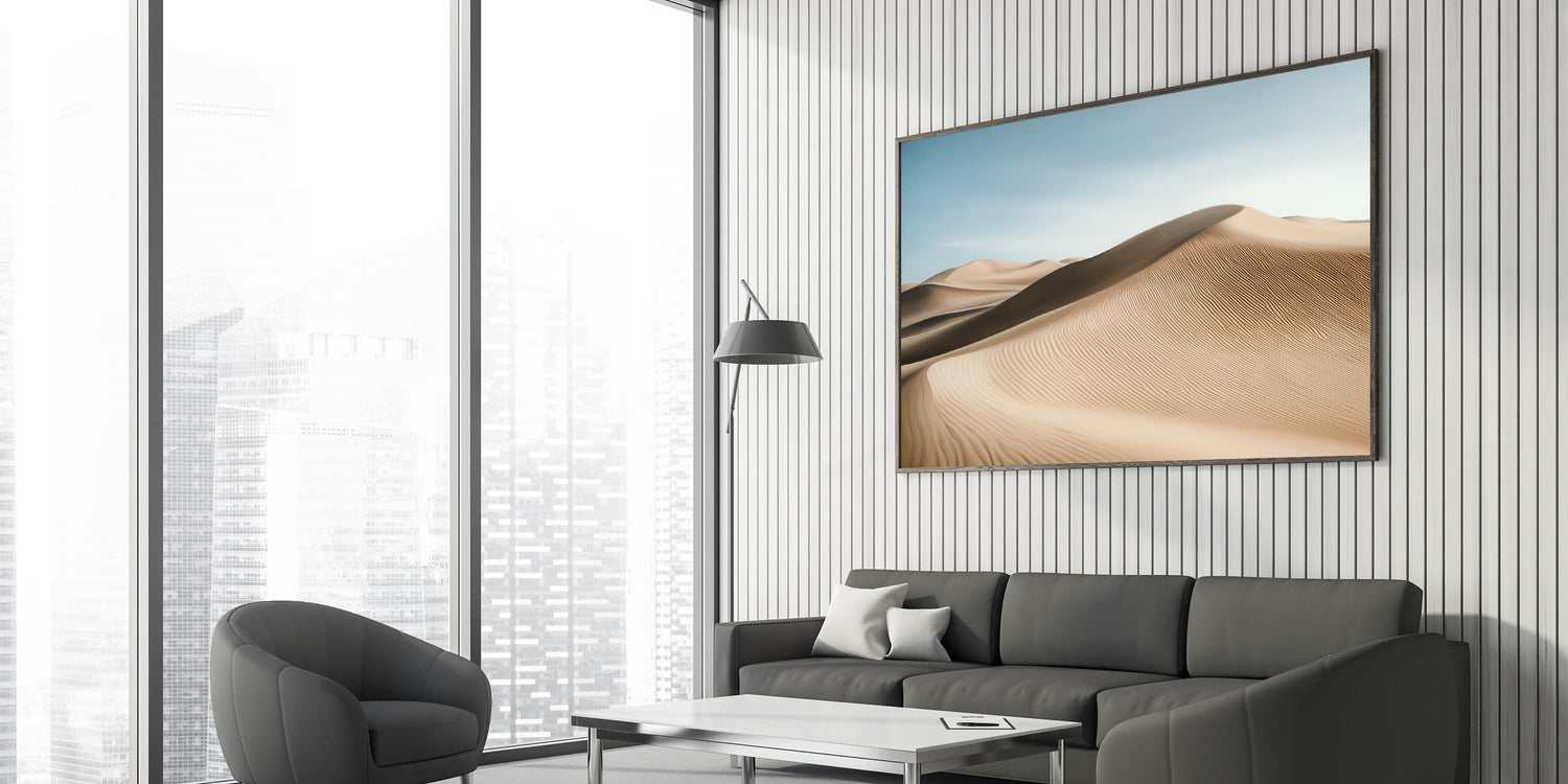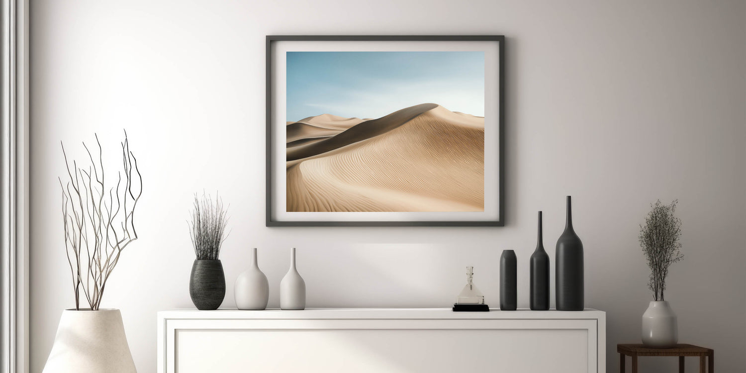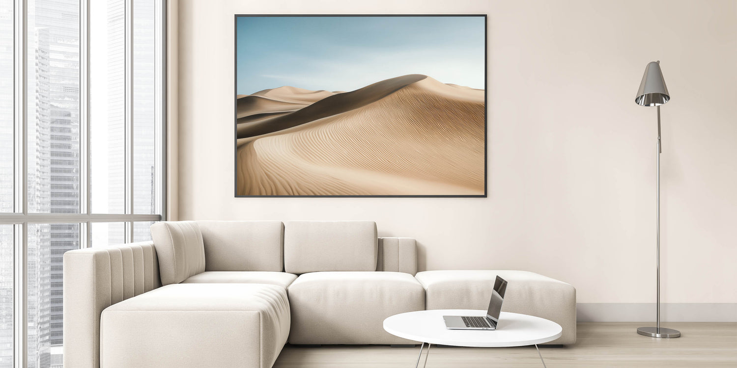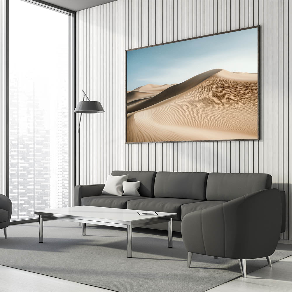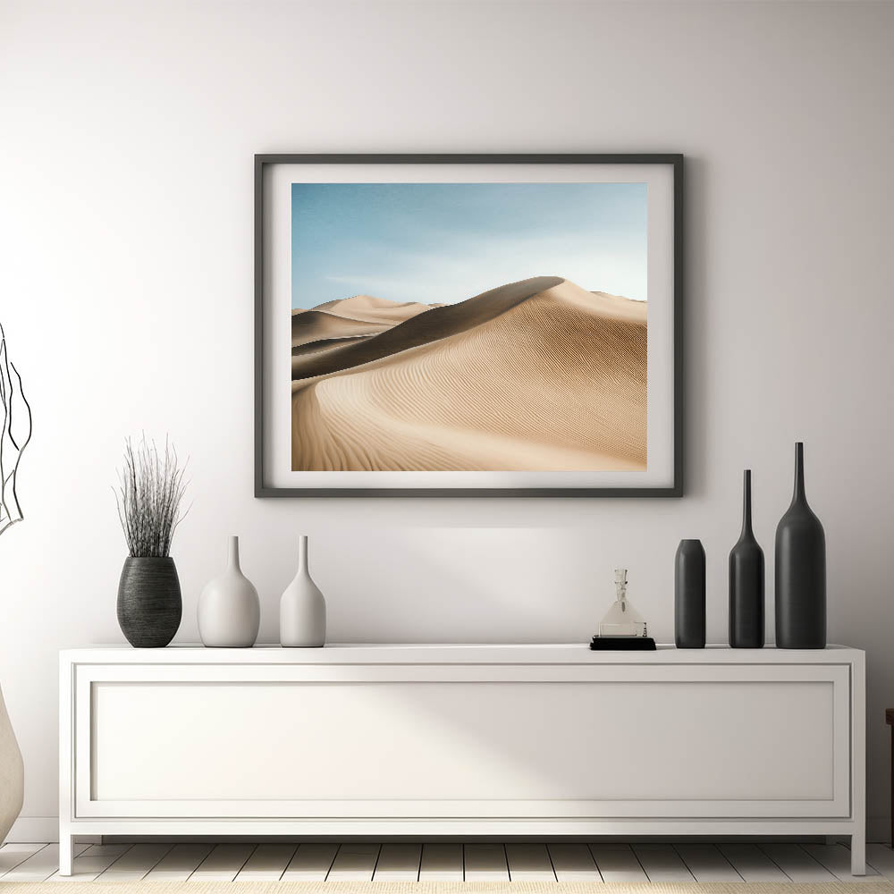 Bring the tranquility of the desert into your space with this captivating wall art featuring sweeping sand dunes under a serene blue sky. The intricate patterns of the dunes and soft gradients of light create a harmonious blend of texture and color, offering a calming and elegant addition to any room.