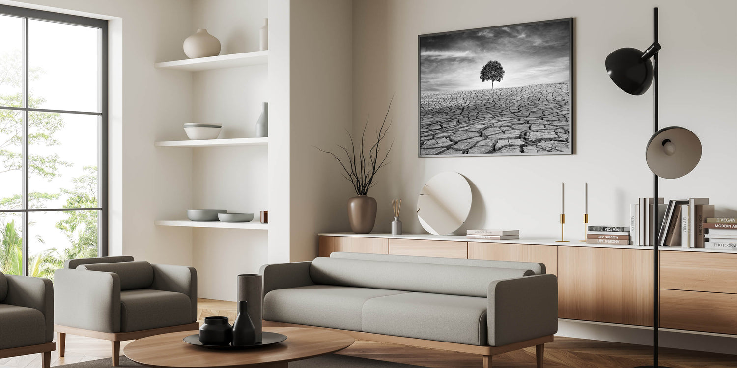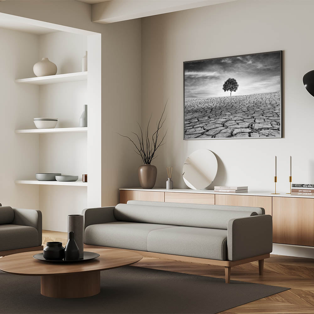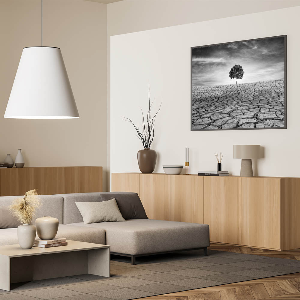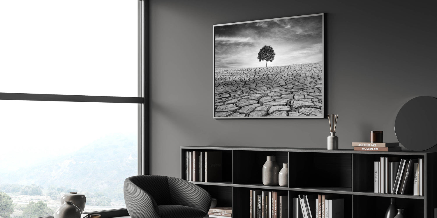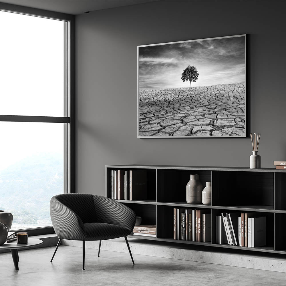 Make a bold statement with this striking black and white wall art, featuring a solitary tree standing tall amidst a cracked desert landscape. The stark contrast between the dark tree and the pale, parched ground creates a powerful image that evokes feelings of resilience, strength, and endurance. This minimalist yet impactful piece is perfect for those who appreciate the beauty of simplicity and the drama of monochrome art.