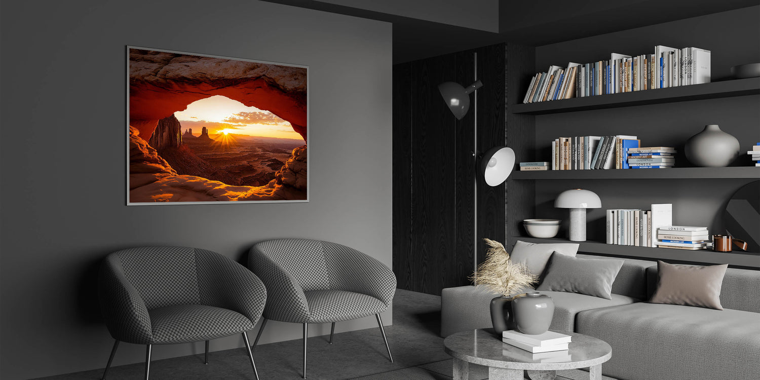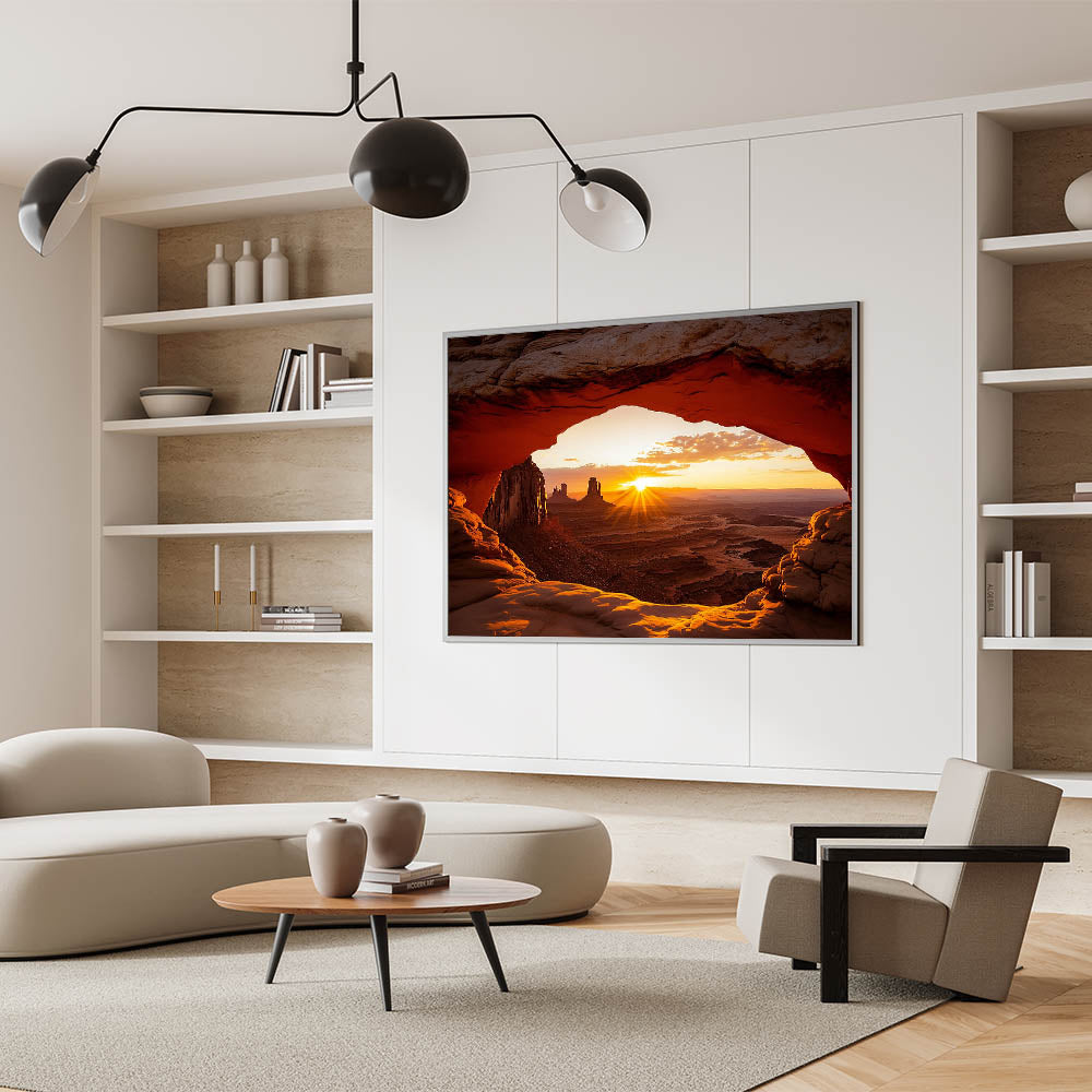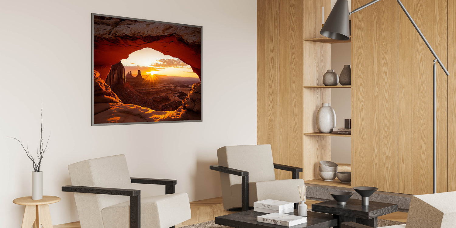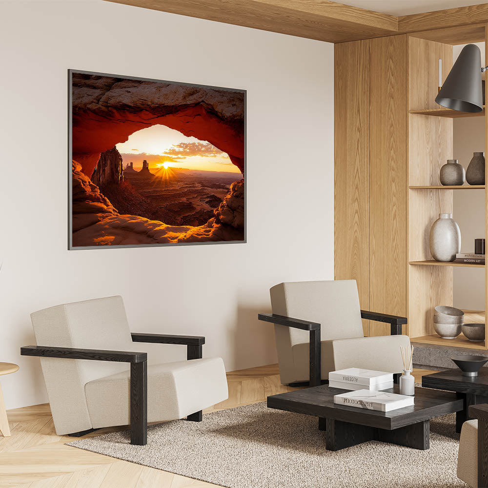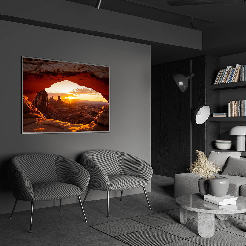 Celebrate the breathtaking beauty of this Southwestern desert art, featuring a glowing sunrise framed by a stunning natural rock arch. The golden sunlight bathes the dramatic landscape, highlighting the rugged textures and vibrant hues of the desert. This captivating artwork adds warmth and elegance to any interior.
