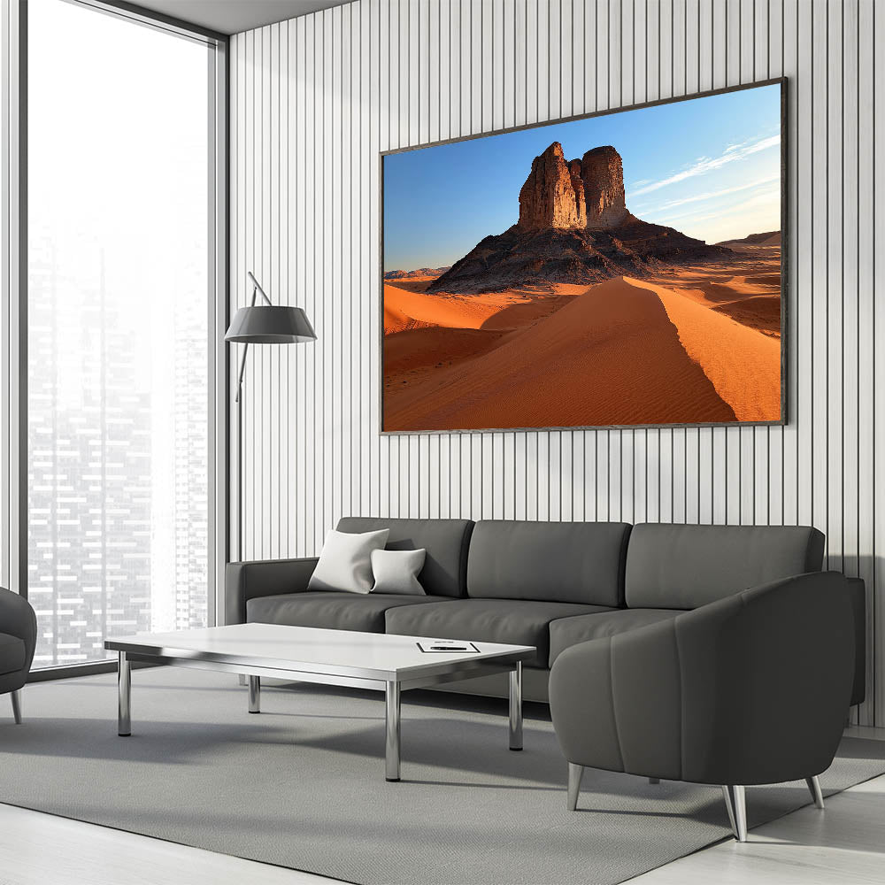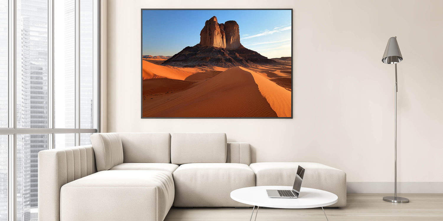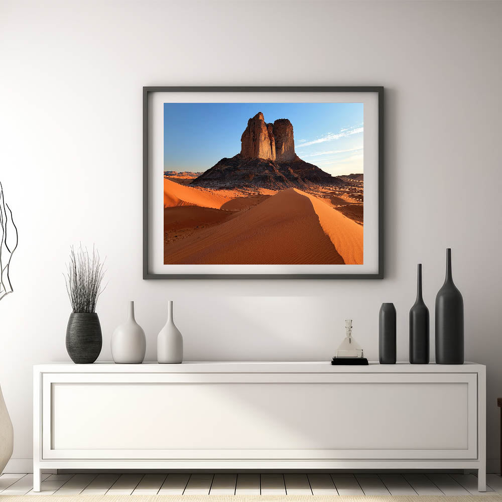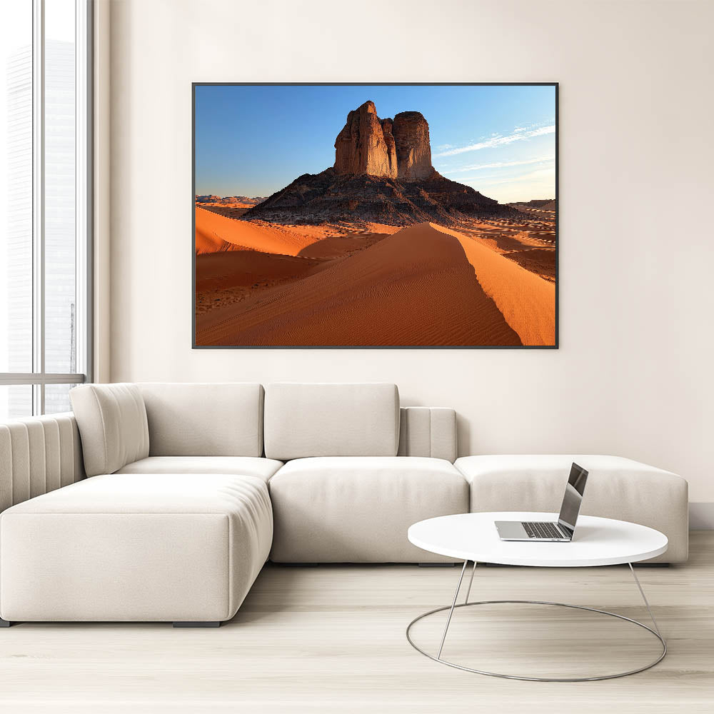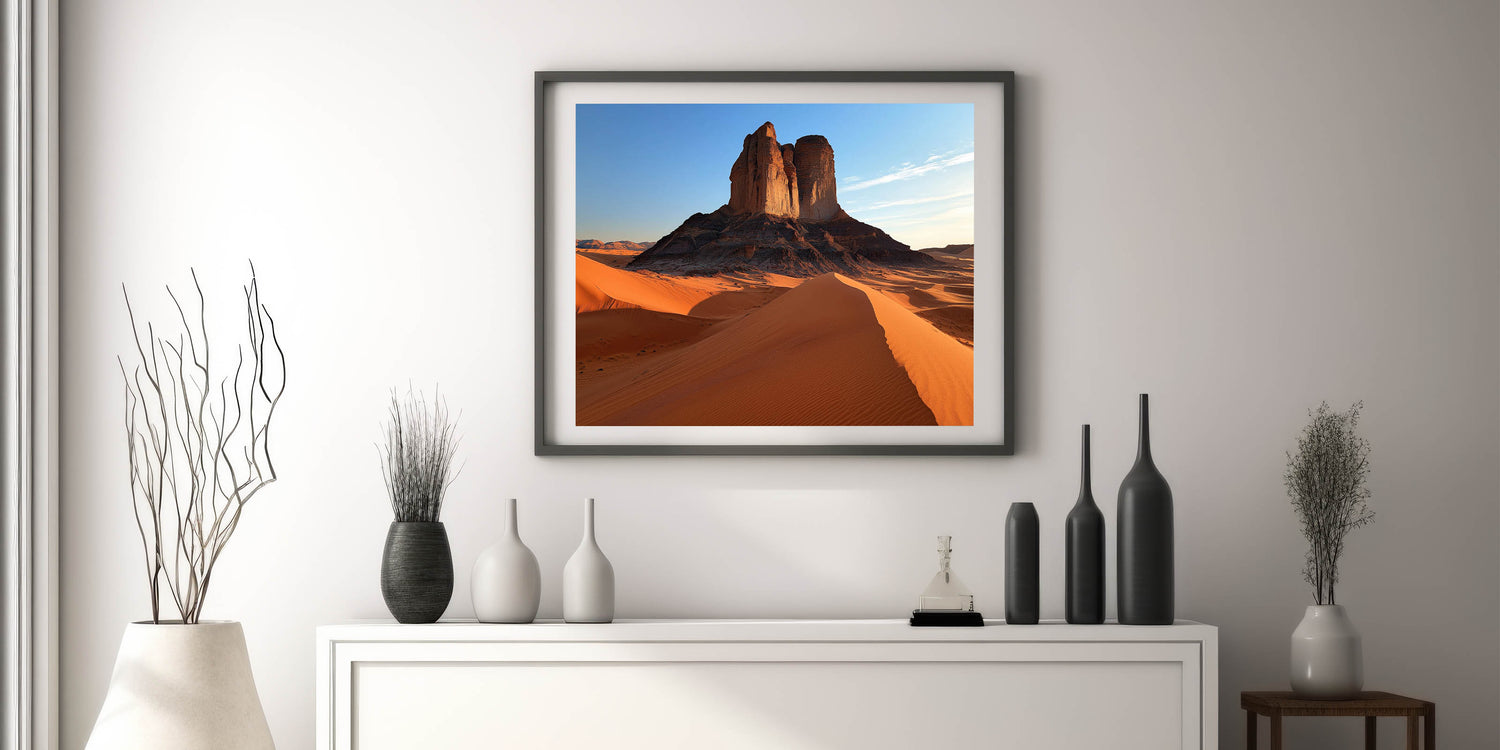 Celebrate the majestic beauty of the desert with this breathtaking artwork featuring a towering rock formation surrounded by golden sand dunes. The interplay of warm orange tones and deep shadows highlights the dramatic textures of the landscape, making it an extraordinary piece for your space.