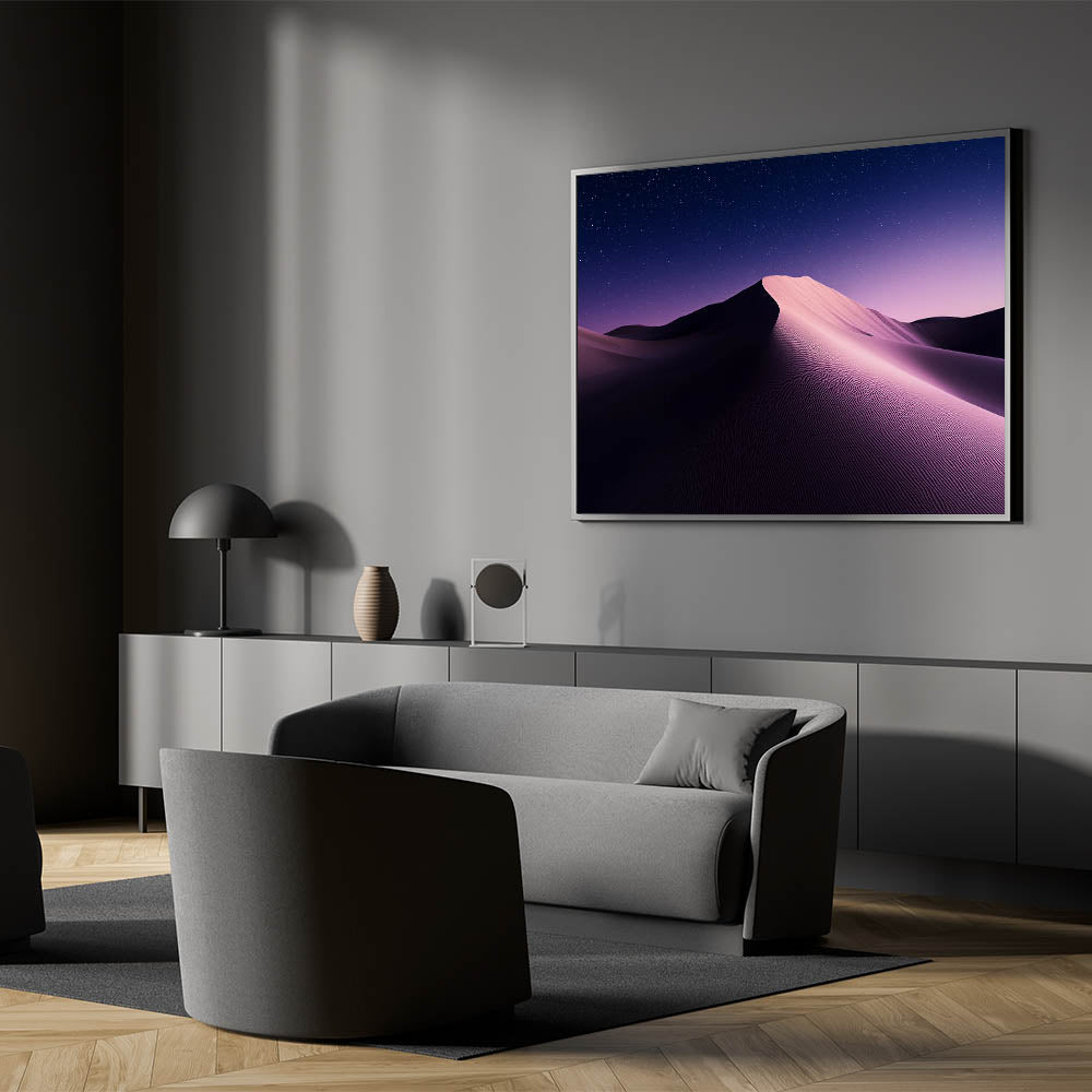 Immerse yourself in the captivating beauty of the desert night with this stunning desert artwork. Featuring illuminated sand dunes under a breathtaking starry sky, this piece captures the quiet elegance and mystery of the desert after dark. The soft glow of the dunes and the rich, deep hues of the sky make it a striking addition to any space.