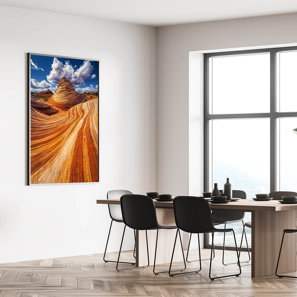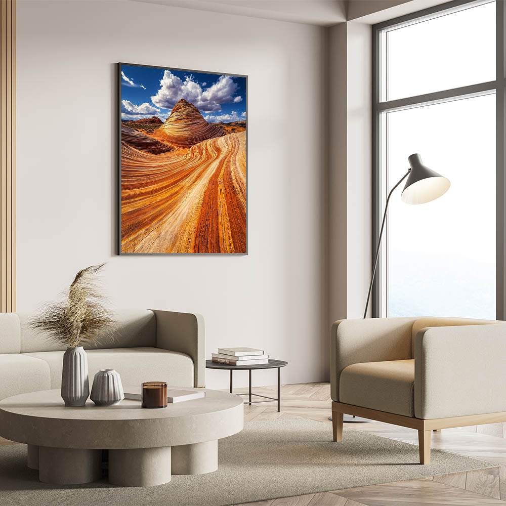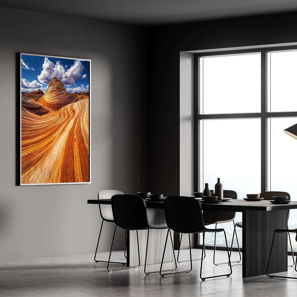 Immerse yourself in the stunning beauty of nature with this mesmerizing sandstone artwork. Featuring vivid waves of orange and gold, this piece captures the intricate patterns carved by wind and time. Set against a dramatic blue sky with billowing clouds, the image radiates warmth and grandeur, bringing the raw beauty of the desert to your space.