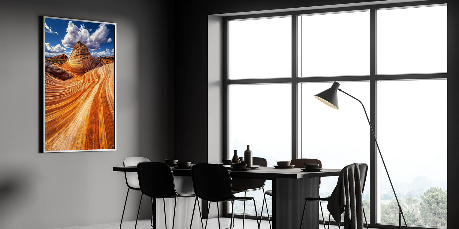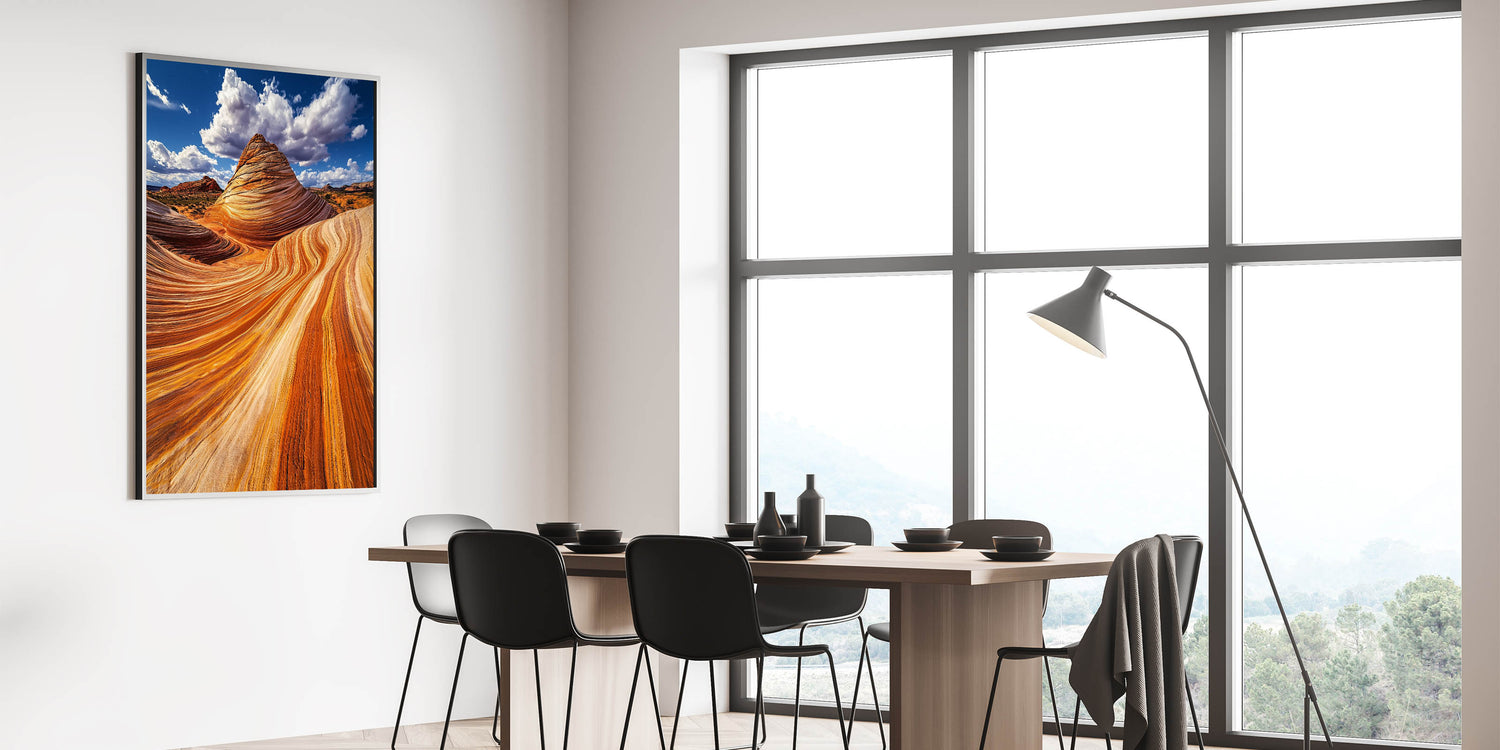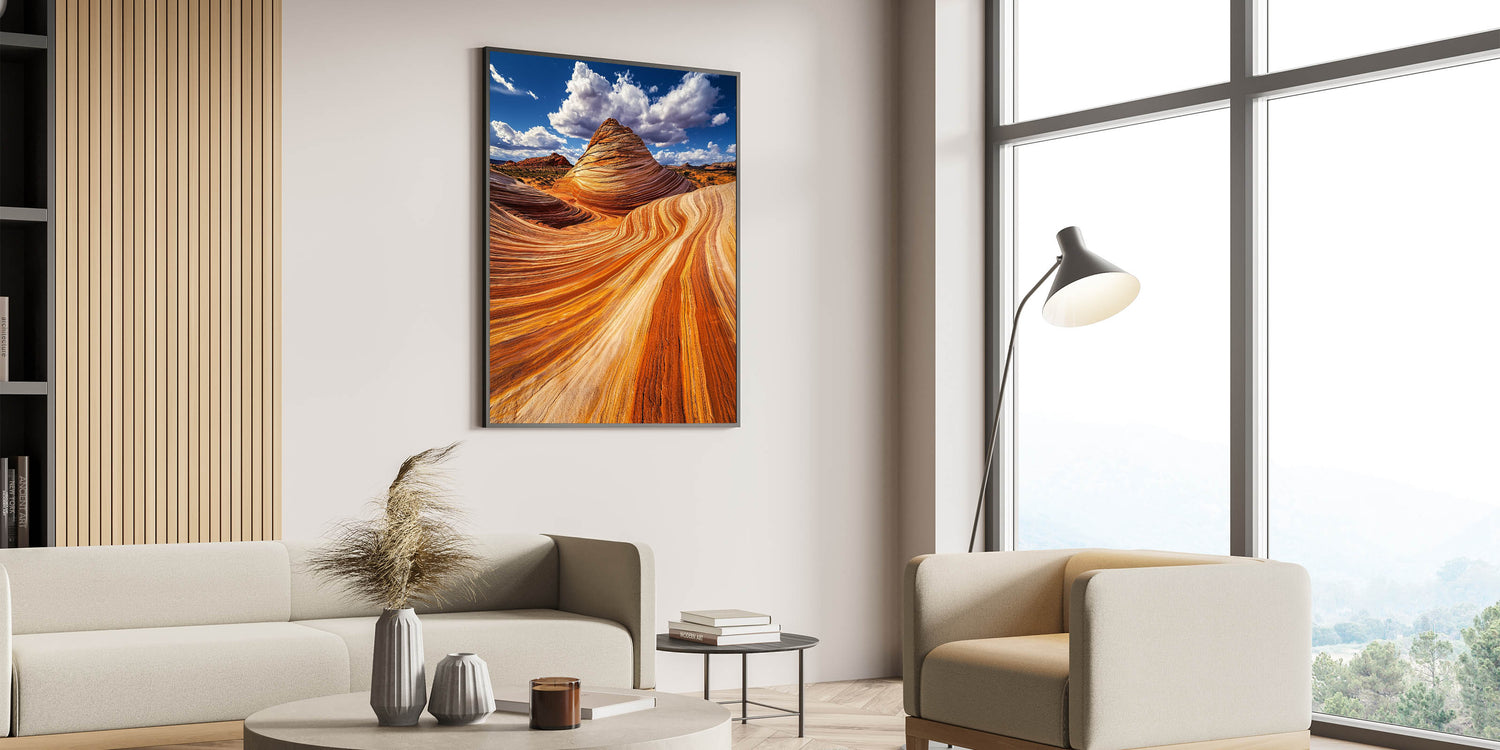 Immerse yourself in the stunning beauty of nature with this mesmerizing sandstone artwork. Featuring vivid waves of orange and gold, this piece captures the intricate patterns carved by wind and time. Set against a dramatic blue sky with billowing clouds, the image radiates warmth and grandeur, bringing the raw beauty of the desert to your space.