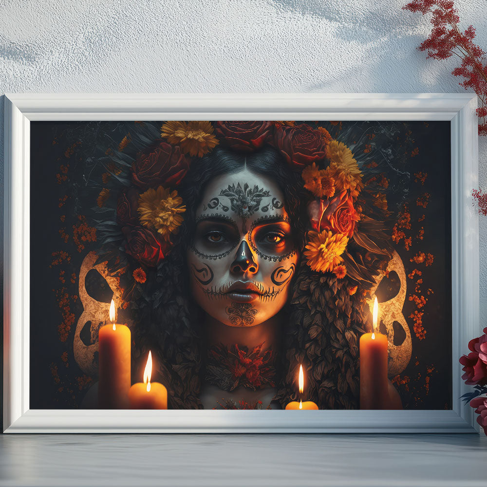 Immerse yourself in the mystical beauty of Día de los Muertos with this captivating Día de los Muertos Wall Art. This stunning Sugar Skull Wall Art features an ethereal Catrina illuminated by glowing candlelight, surrounded by vibrant marigolds and deep red roses. The dark, moody background contrasts with the warm golden hues, creating a mesmerizing Day of the Dead Art Print that embodies both remembrance and reverence.
