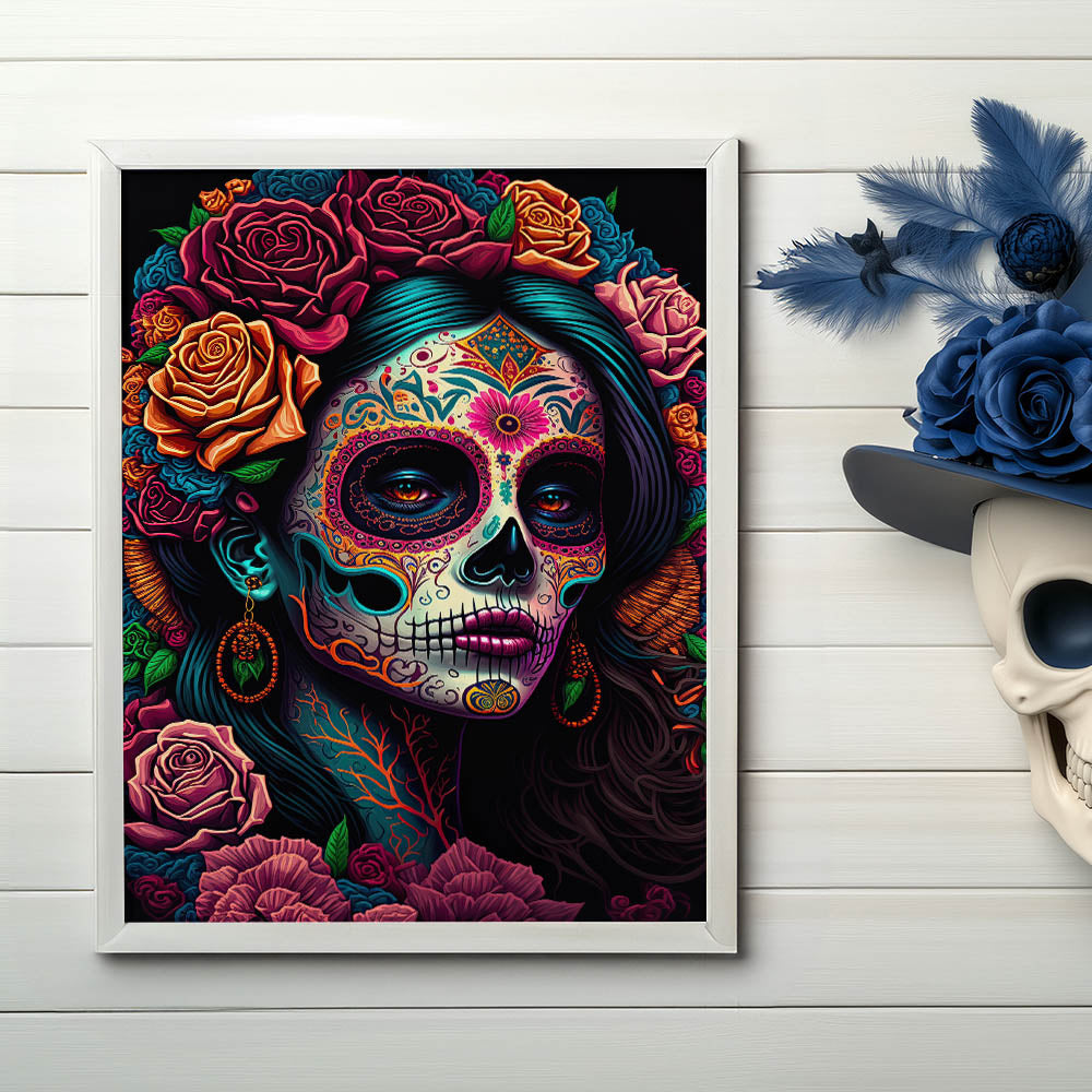 Celebrate the vibrant spirit of Día de los Muertos with this stunning Day of the Dead Wall Art. This mesmerizing Sugar Skull Wall Art features an intricate Catrina portrait adorned with detailed face paint, rich floral embellishments, and bold, vivid colors. The deep contrast of teal, magenta, and orange creates a breathtaking Día de los Muertos Art Print that embodies beauty, tradition, and culture.