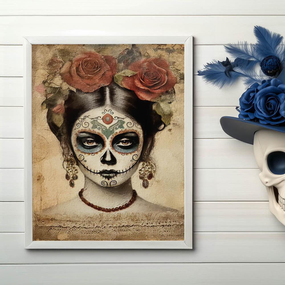 Celebrate the rich heritage of Día de los Muertos with this exquisite Día de los Muertos Canvas Art. This striking Sugar Skull Wall Art showcases a beautifully detailed Catrina, adorned with deep red roses, intricate face paint, and vintage-inspired jewelry. The warm beige tones, muted greens, and bold burgundy hues create a timeless Day of the Dead Art Print that embodies both elegance and remembrance.