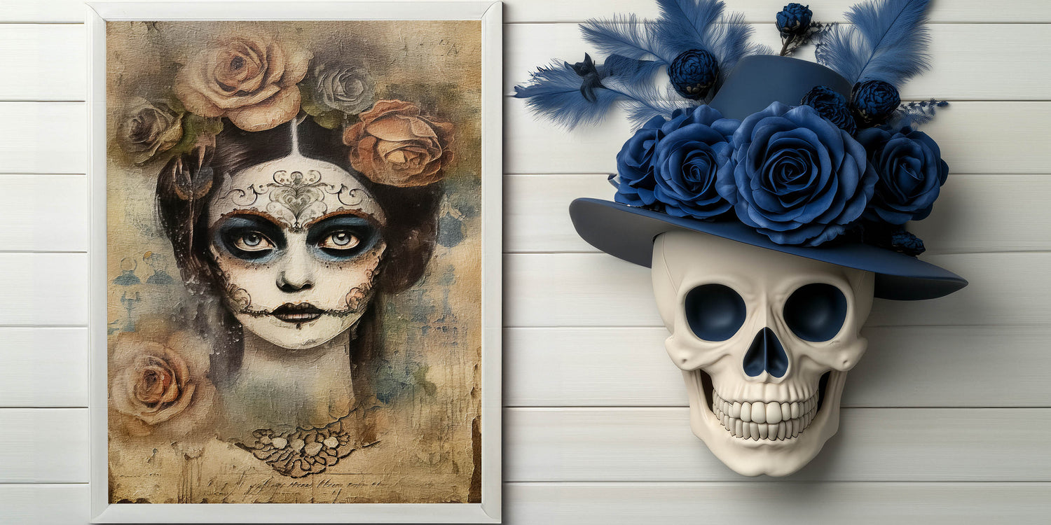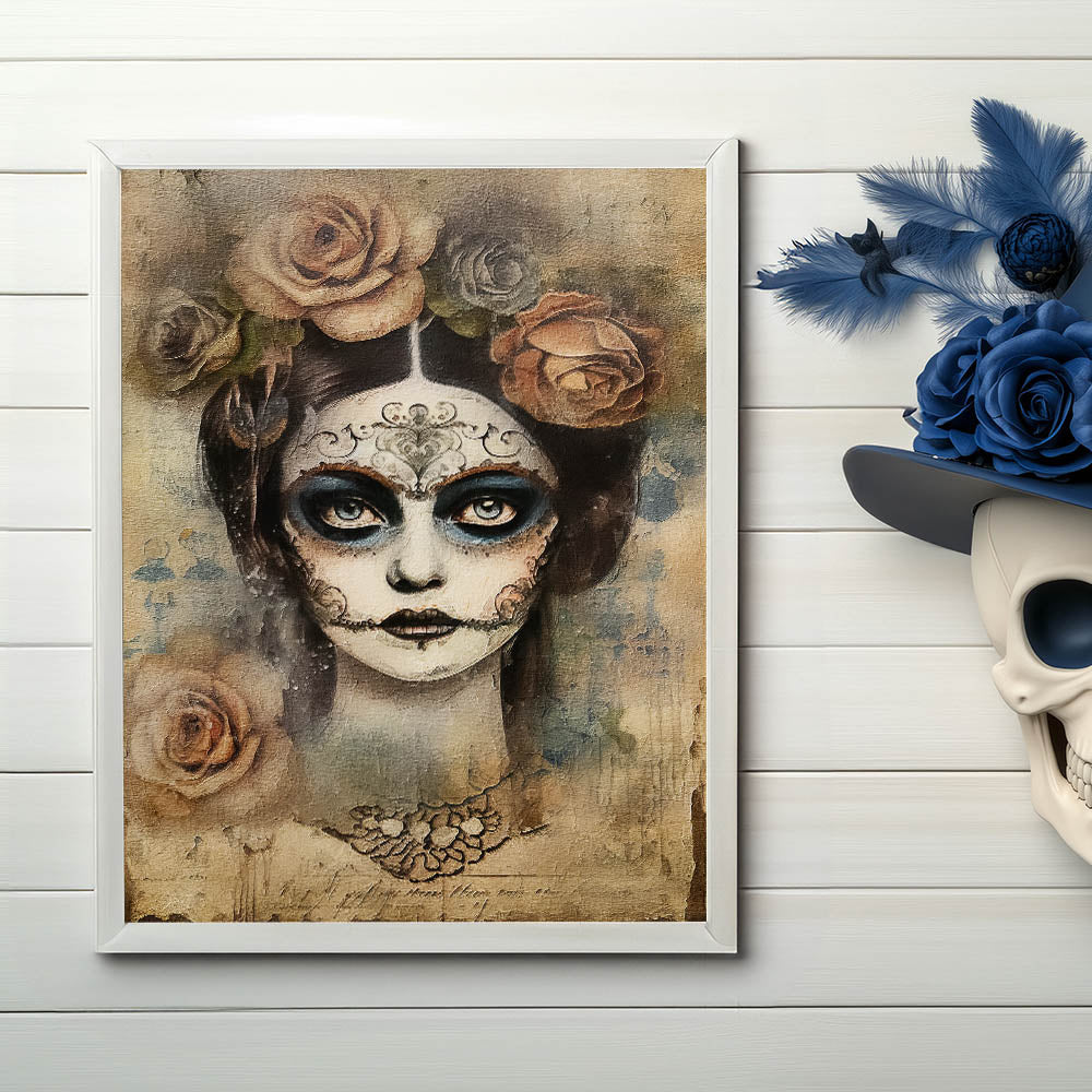 Celebrate the mystical beauty of Día de los Muertos with this enchanting Sugar Skull Wall Art. This captivating Mexican Skull Art features a delicate portrait of a woman with traditional Day of the Dead face paint, set against a soft vintage background. The warm beige and muted blue hues, combined with intricate floral elements, give this Día de los Muertos Art Print a timeless and ethereal quality.