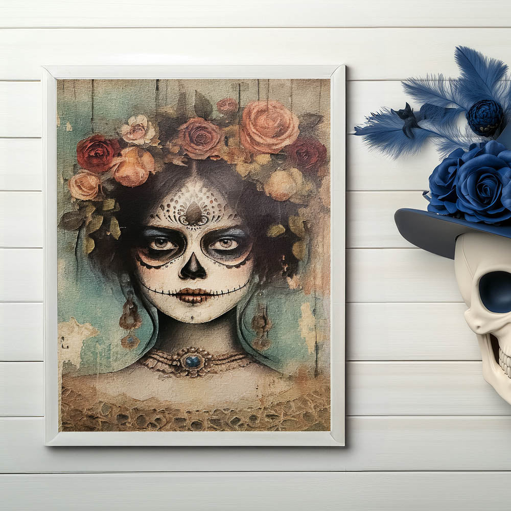 Celebrate the elegance of Día de los Muertos with this breathtaking Sugar Skull Wall Art. This mesmerizing Mexican Skull Art features a beautifully adorned woman with traditional Day of the Dead face paint, surrounded by an intricate floral crown. The soft teal background, earthy browns, and muted peach tones create a timeless Día de los Muertos Art Print that embodies both beauty and remembrance.