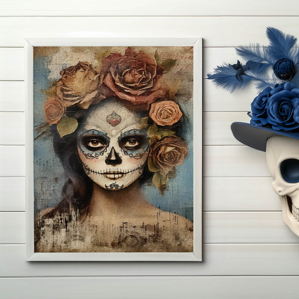 Celebrate the spirit of Día de los Muertos with this stunning Sugar Skull Wall Art. Featuring a captivating Mexican Skull Art portrait of a woman adorned with intricate Day of the Dead face paint, this artwork embraces tradition and beauty. The soft yet bold composition, with its deep brown, beige, and muted blue hues, creates a timeless Día de los Muertos Art Print. The floral crown of rustic roses adds a touch of elegance, symbolizing love and remembrance.