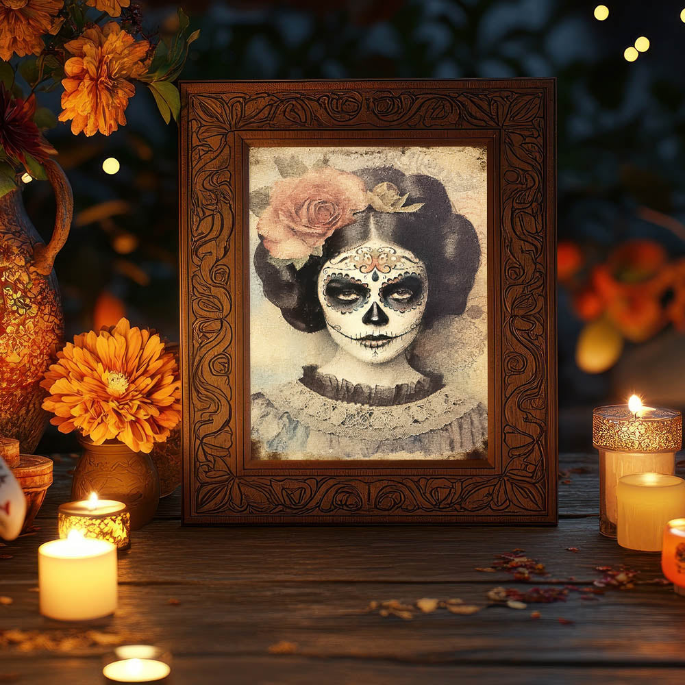 Celebrate the timeless beauty of Día de los Muertos with this elegant Sugar Skull Wall Art. This stunning Mexican Skull Art features a vintage-inspired portrait of a woman with traditional Day of the Dead face paint, intricate lace details, and a delicate floral accent. The soft sepia tones, muted beige, and warm peach hues give this Día de los Muertos Art Print a classic, nostalgic feel.
