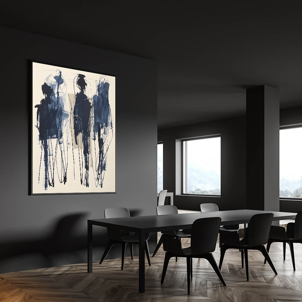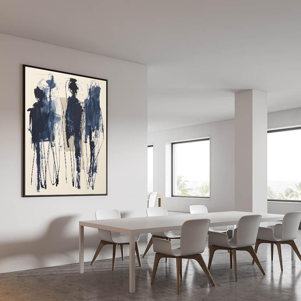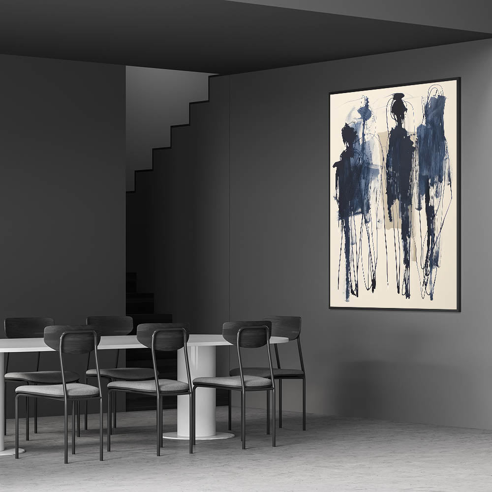 Add a bold artistic statement to your dining space with this acrylic dining room artwork, featuring an expressive abstract design in deep navy blue on a soft beige background. The fluid brushstrokes and intricate linework create a sense of movement, making this piece an eye-catching focal point in modern and contemporary interiors. This framed dining room print is perfect for those who appreciate avant-garde and abstract expressionist art.