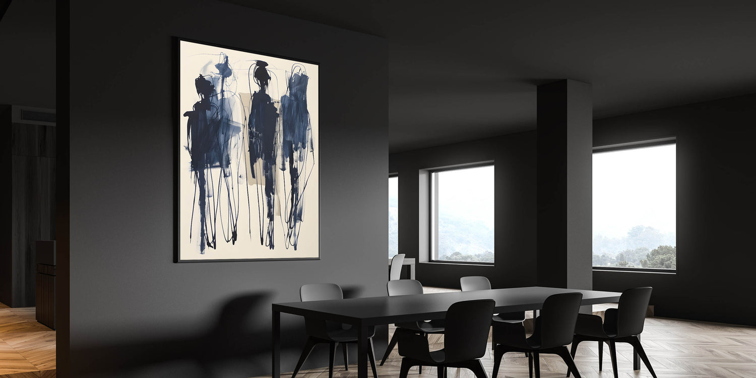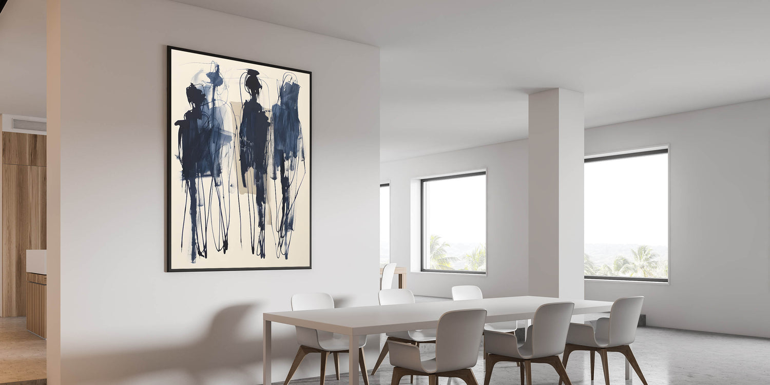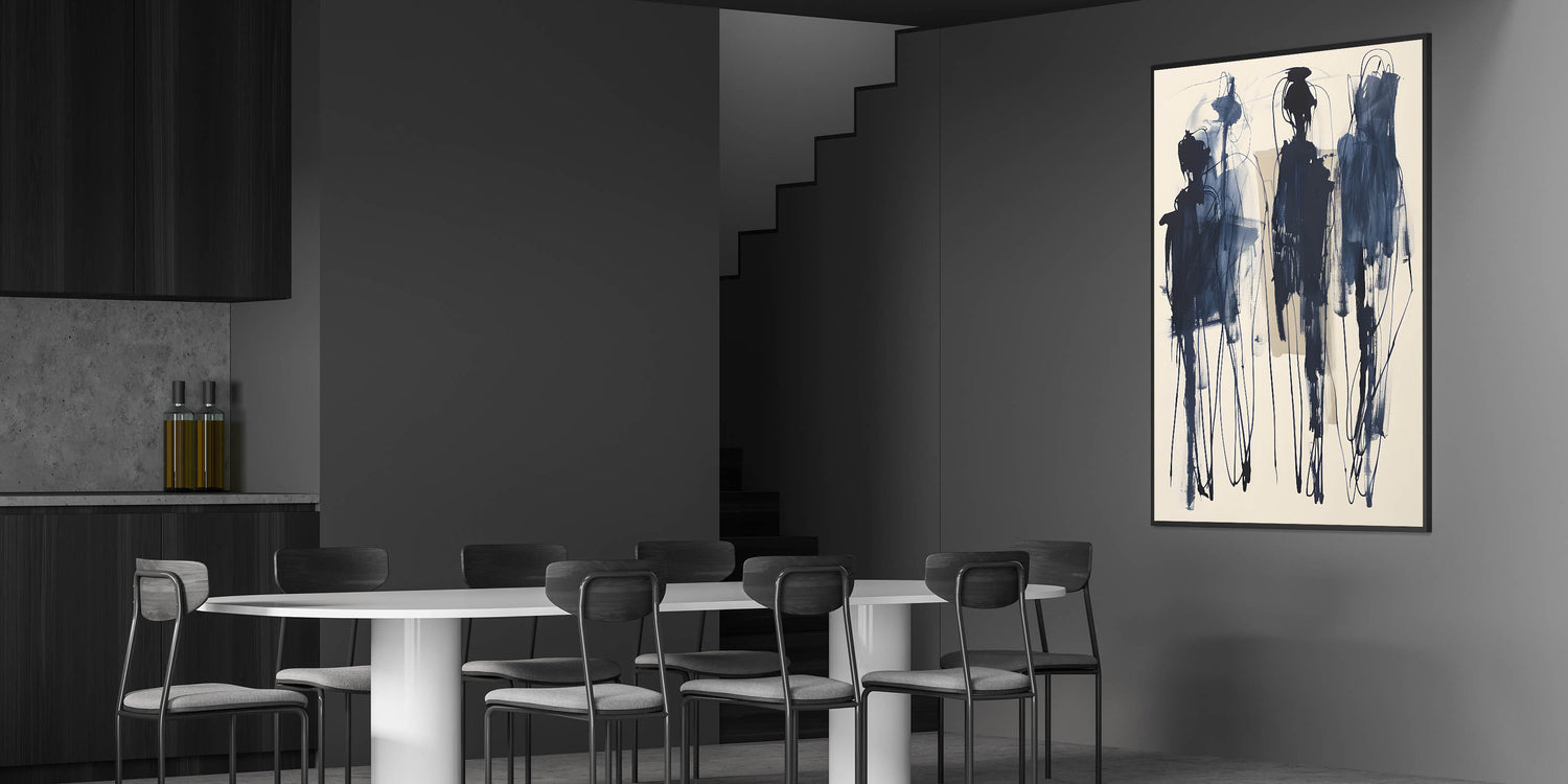 Add a bold artistic statement to your dining space with this acrylic dining room artwork, featuring an expressive abstract design in deep navy blue on a soft beige background. The fluid brushstrokes and intricate linework create a sense of movement, making this piece an eye-catching focal point in modern and contemporary interiors. This framed dining room print is perfect for those who appreciate avant-garde and abstract expressionist art.