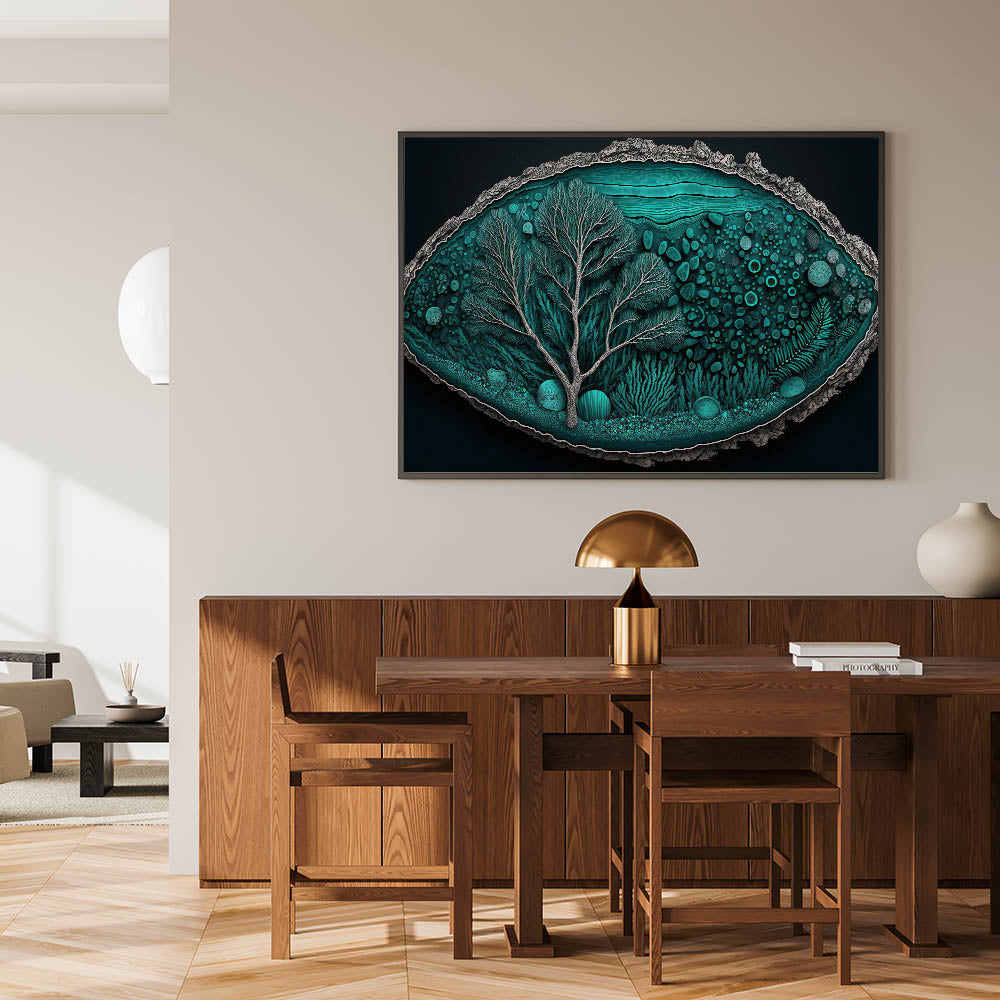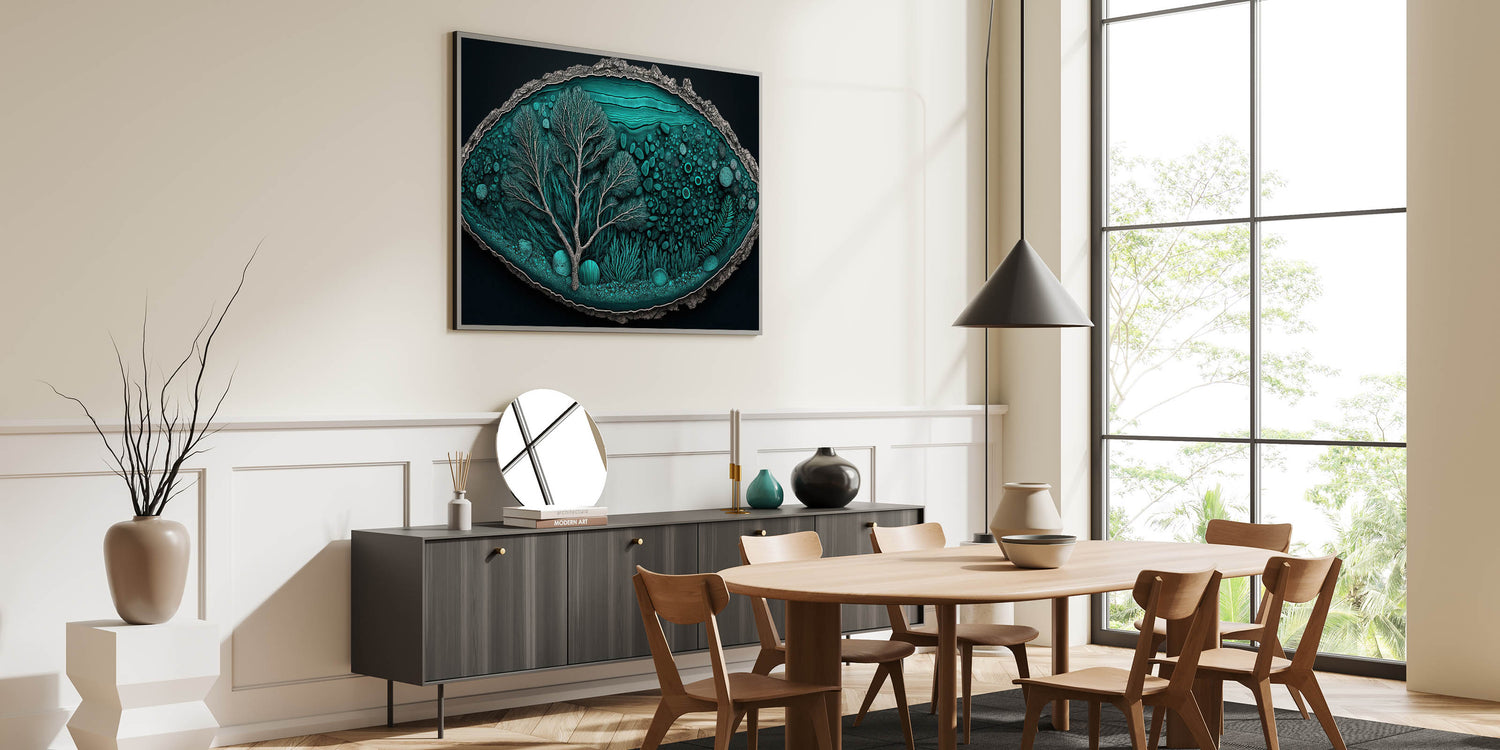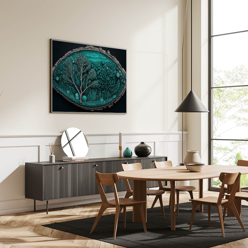 Transform your dining space with this acrylic dining room artwork, featuring a mesmerizing geode-inspired abstract design in stunning shades of teal and silver. The intricate detailing of natural tree formations and crystal-like textures creates a captivating visual effect, blending nature with contemporary elegance.