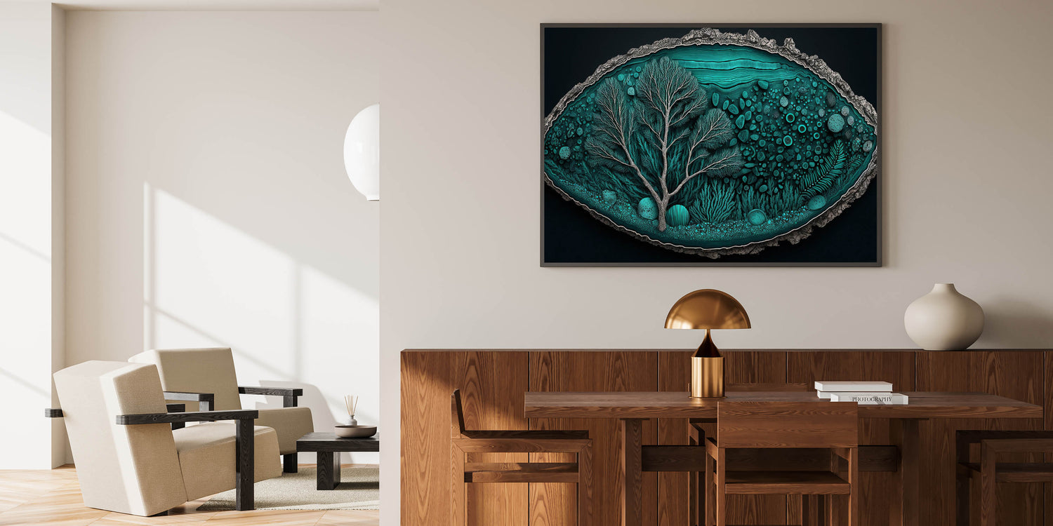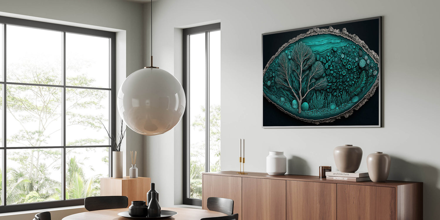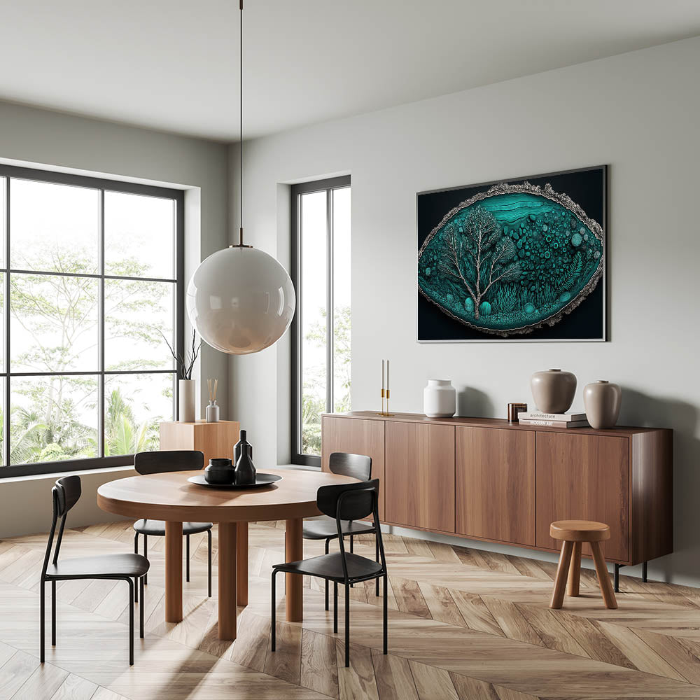 Transform your dining space with this acrylic dining room artwork, featuring a mesmerizing geode-inspired abstract design in stunning shades of teal and silver. The intricate detailing of natural tree formations and crystal-like textures creates a captivating visual effect, blending nature with contemporary elegance.