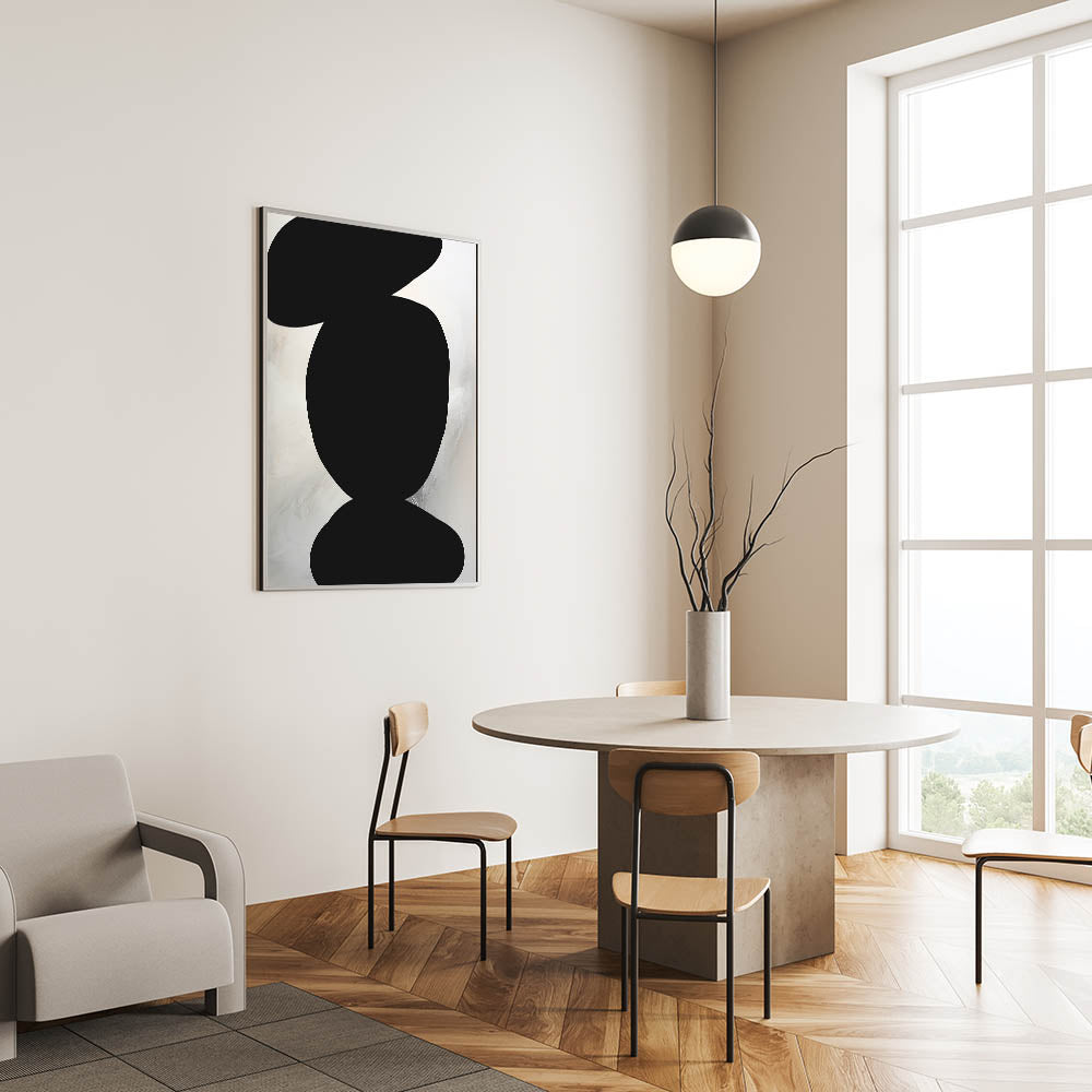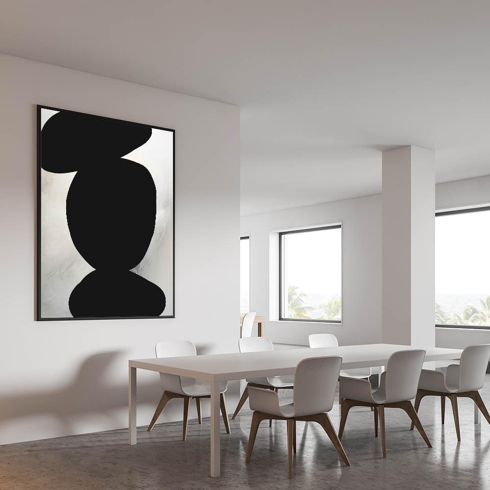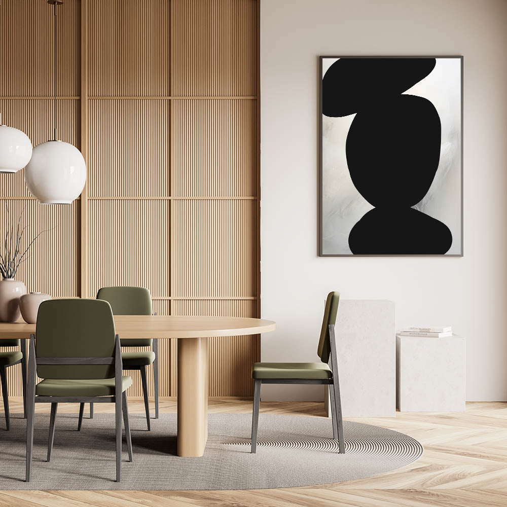 Transform your dining space with this acrylic dining room artwork, featuring a bold black abstract composition on a soft white background. The stacked organic shapes create a striking contrast, making this elegant dining room wall art an eye-catching statement piece for contemporary and minimalist interiors.