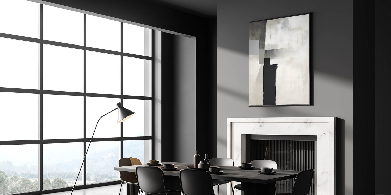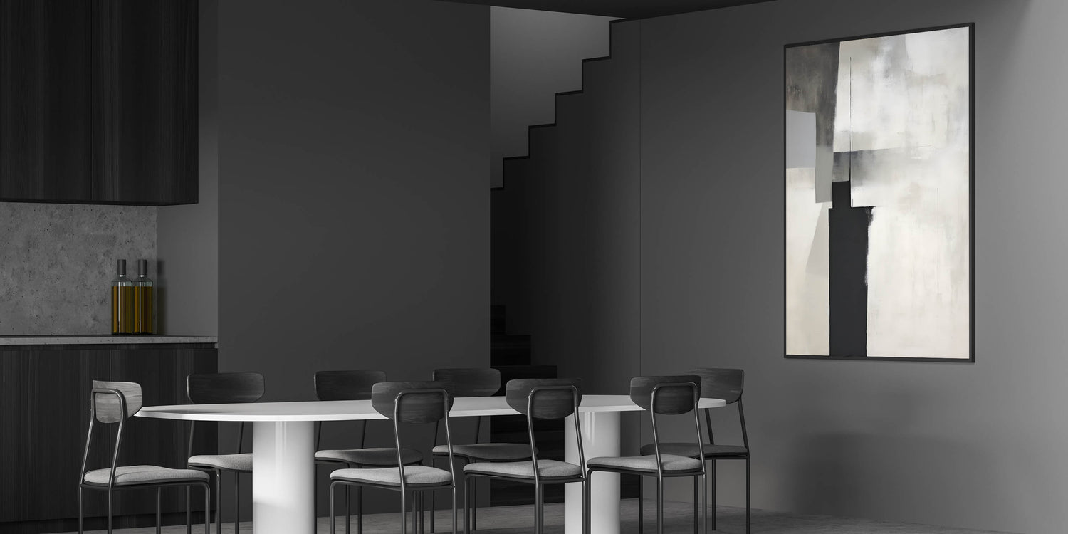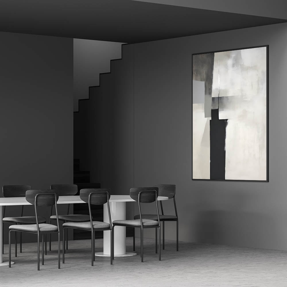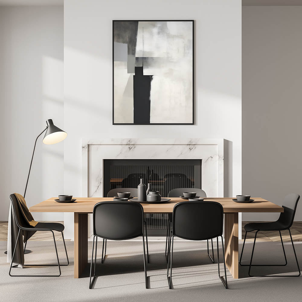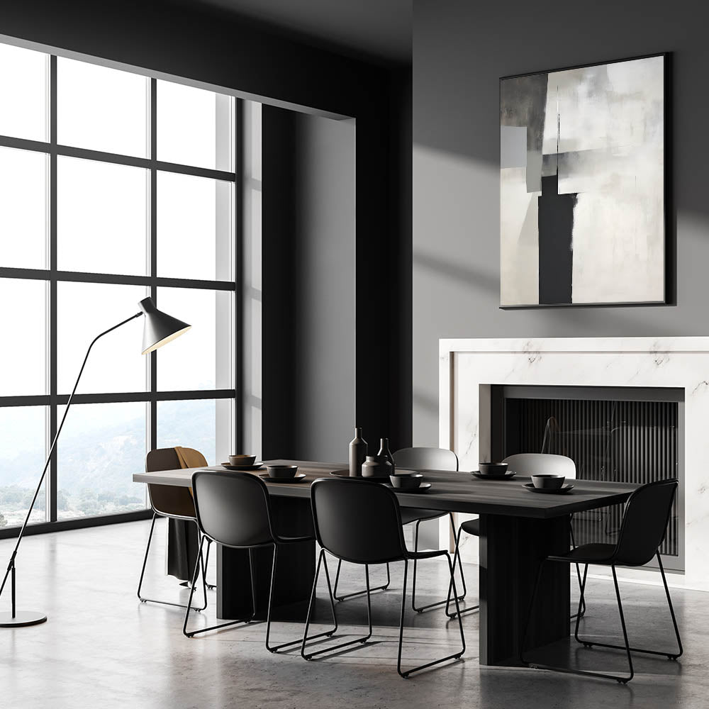 This modern dining room art is perfect for minimalist, industrial, and contemporary interiors, adding depth and sophistication. Whether you choose a rolled canvas print for dining area versatility or a framed dining room print for a polished look, this artwork transforms your space with understated elegance.