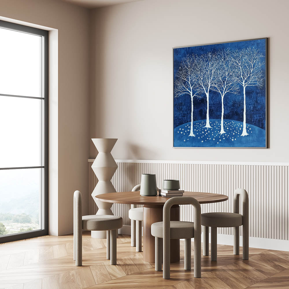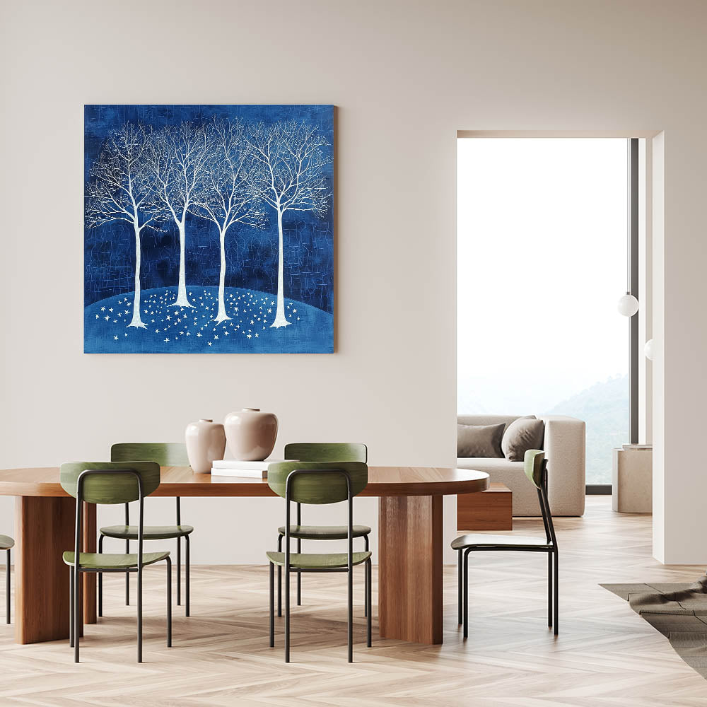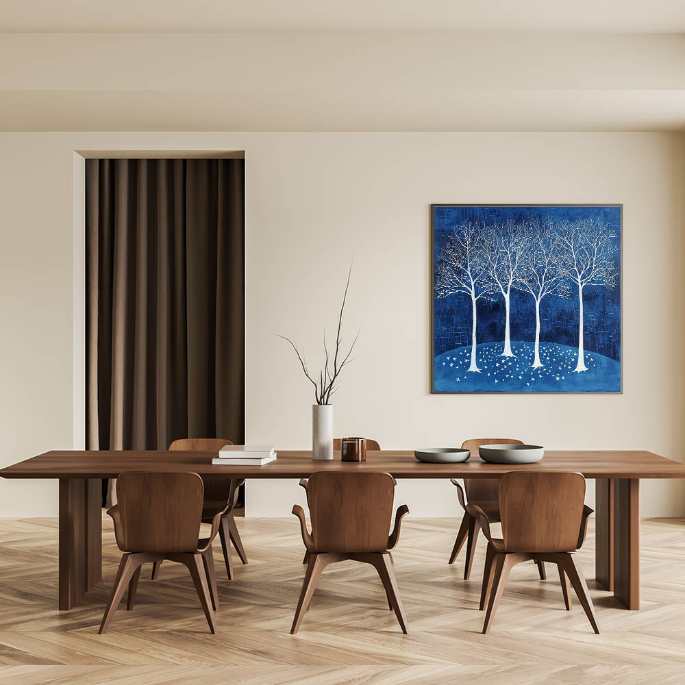 Bring tranquility and elegance to your dining space with this acrylic dining room artwork, featuring a breathtaking scene of white trees against a deep navy blue background. This modern dining room art piece evokes a sense of calm and sophistication, making it a stunning centerpiece for any contemporary or classic dining area.