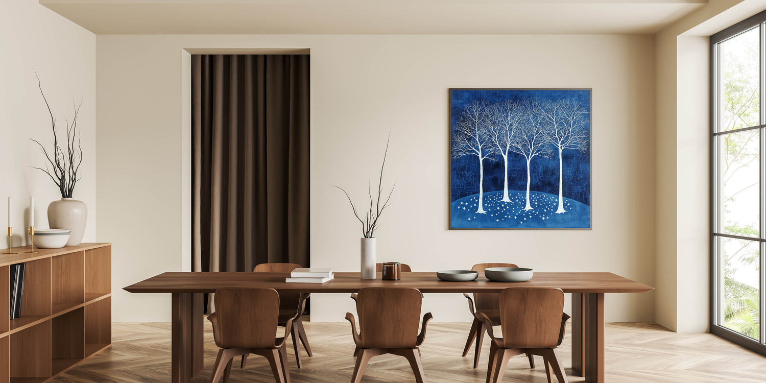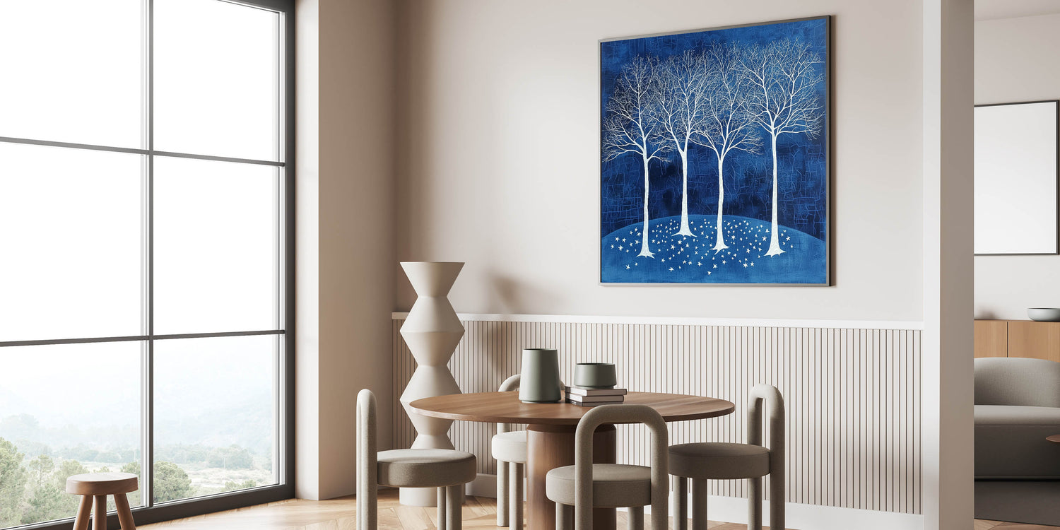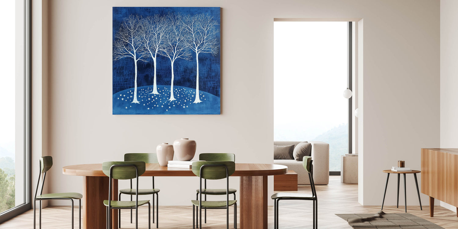 Bring tranquility and elegance to your dining space with this acrylic dining room artwork, featuring a breathtaking scene of white trees against a deep navy blue background. This modern dining room art piece evokes a sense of calm and sophistication, making it a stunning centerpiece for any contemporary or classic dining area.