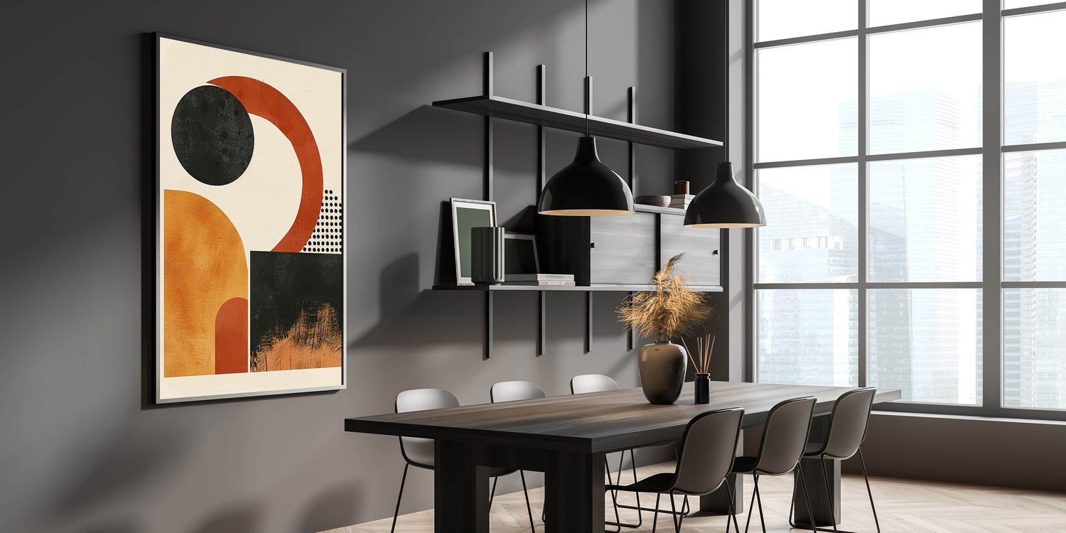 This elegant dining room wall art blends bold contrasts and modern simplicity, creating a stylish and inviting dining atmosphere. Whether displayed alone or as part of a gallery wall, it brings a sophisticated, artistic flair to your space.