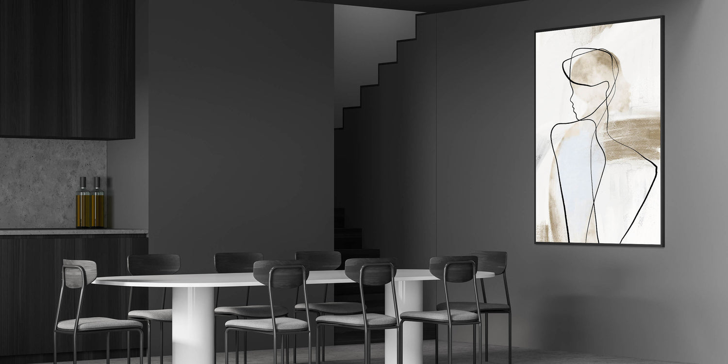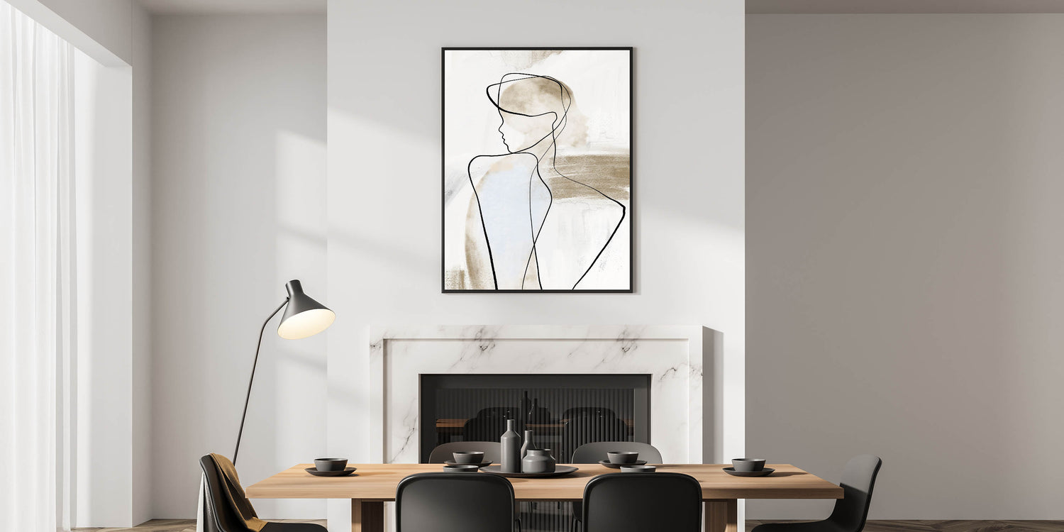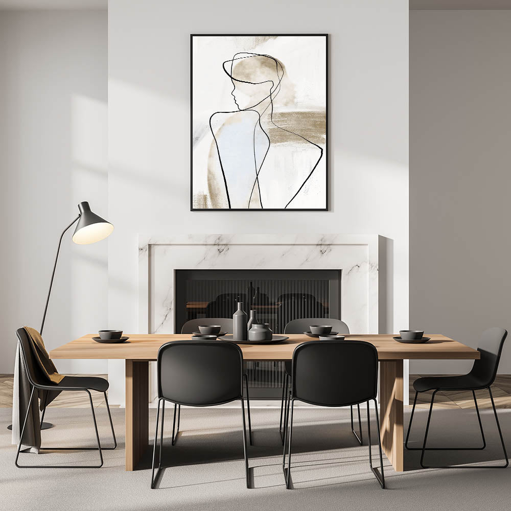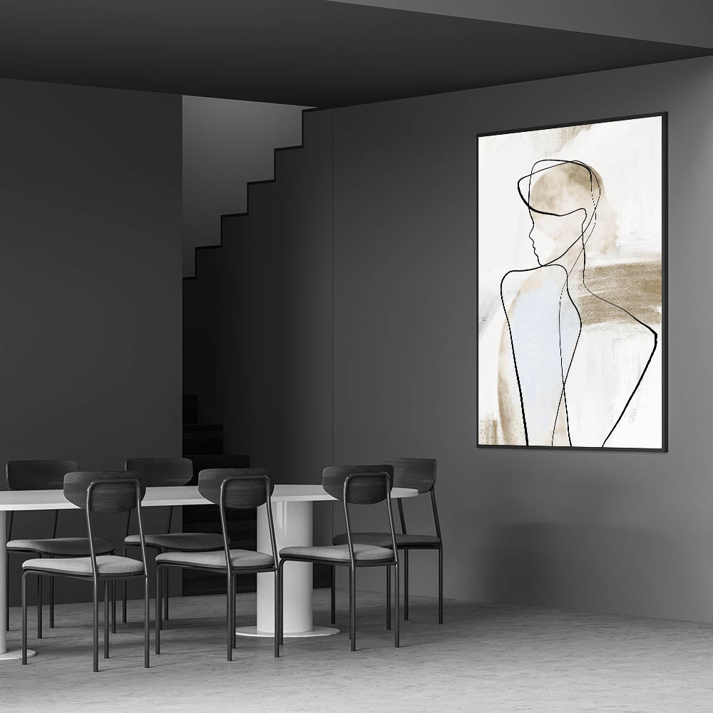 Introduce a touch of sophistication to your dining space with this elegant dining room wall art. Featuring a minimalist line art composition of a human figure in soft beige and black, this artwork exudes modern elegance. The subtle textures and neutral tones make it a perfect addition to any contemporary dining art piece collection.