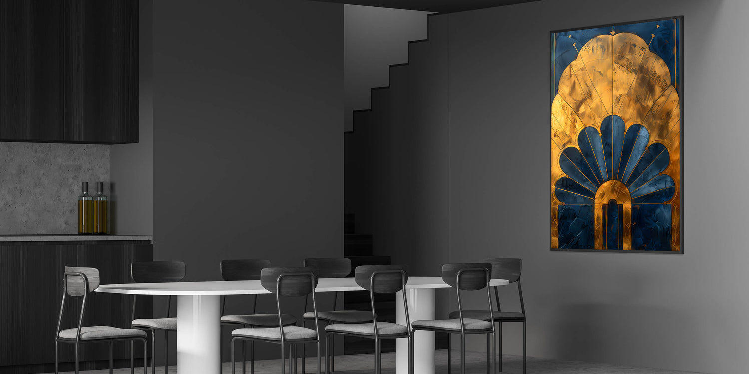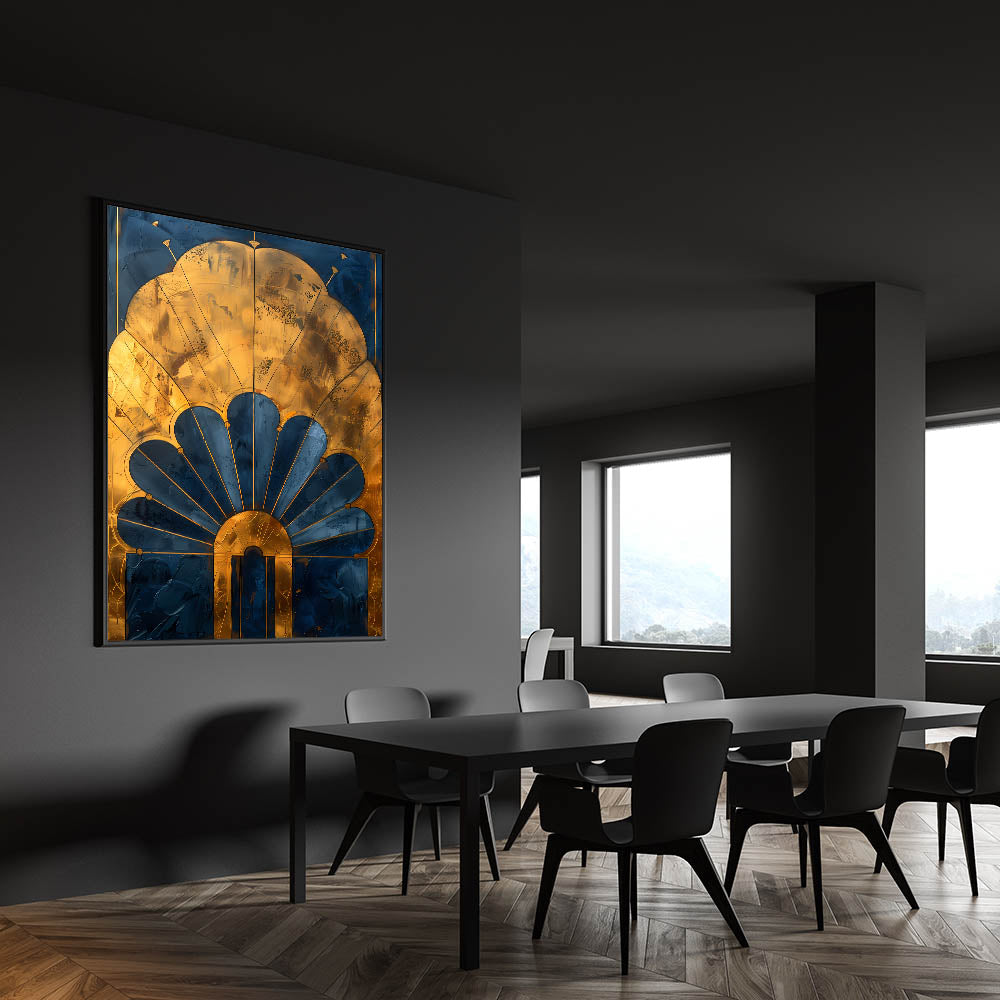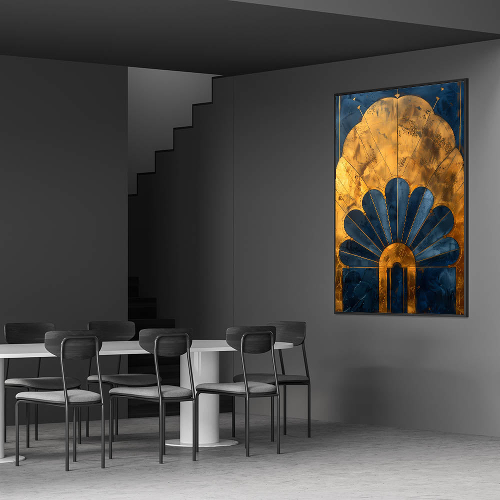 Enhance your dining space with this acrylic dining room artwork, featuring a stunning Art Deco-inspired gold and navy design. The intricate detailing and luxurious metallic accents bring a touch of timeless elegance, making this elegant dining room wall art a sophisticated focal point in any setting.