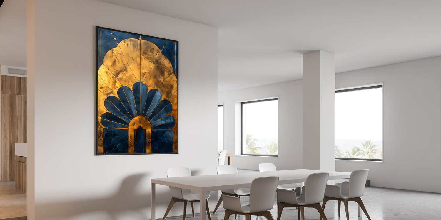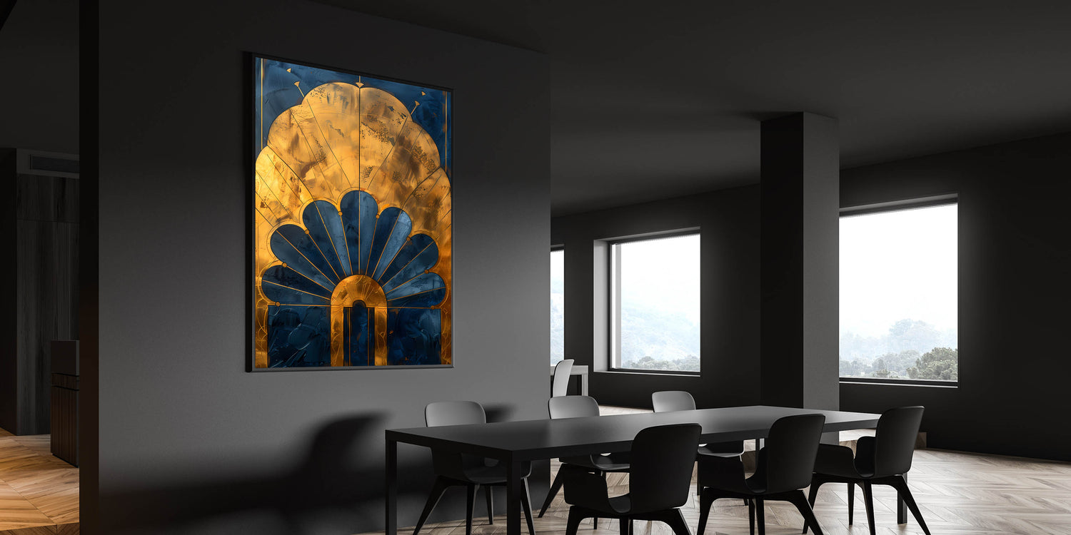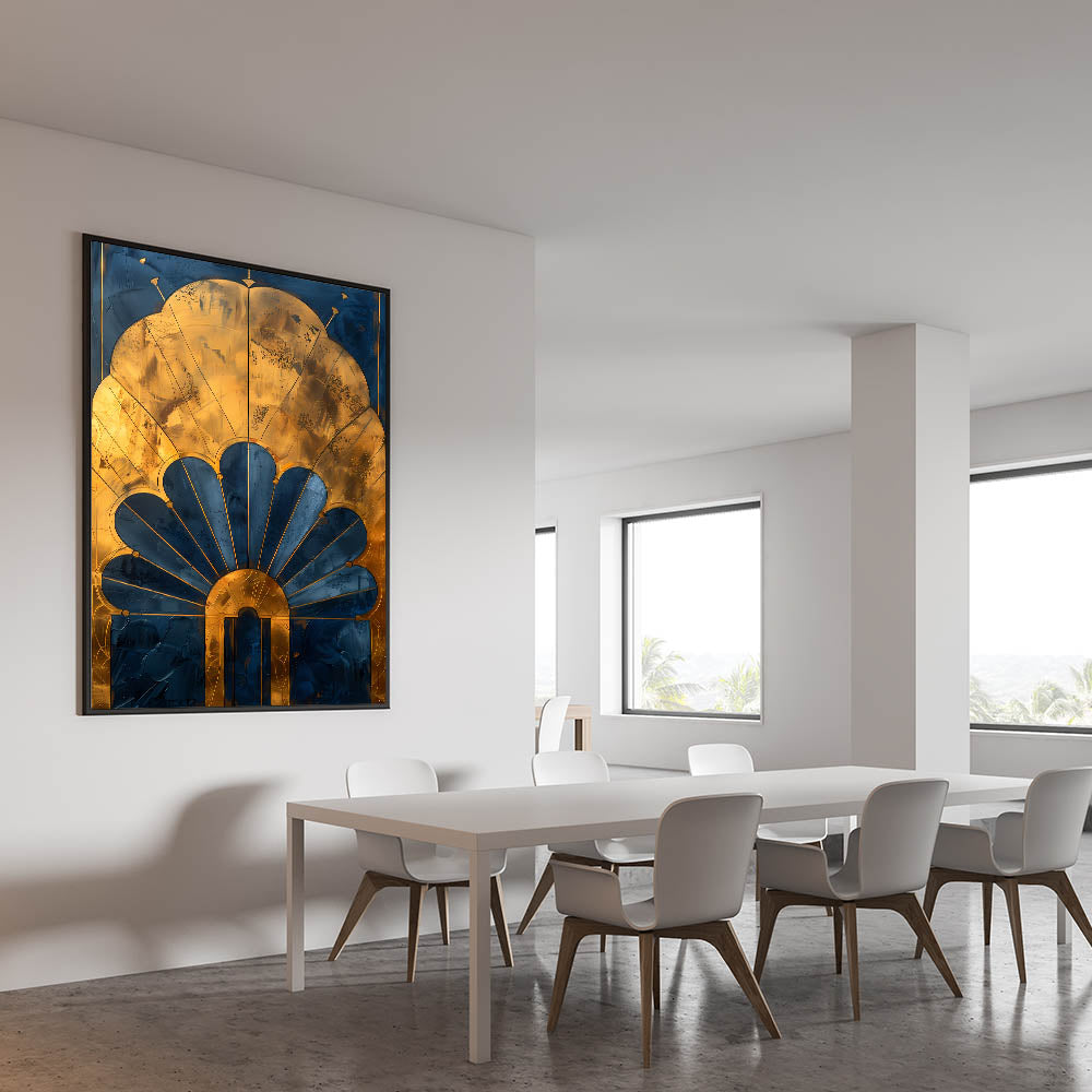 Enhance your dining space with this acrylic dining room artwork, featuring a stunning Art Deco-inspired gold and navy design. The intricate detailing and luxurious metallic accents bring a touch of timeless elegance, making this elegant dining room wall art a sophisticated focal point in any setting.