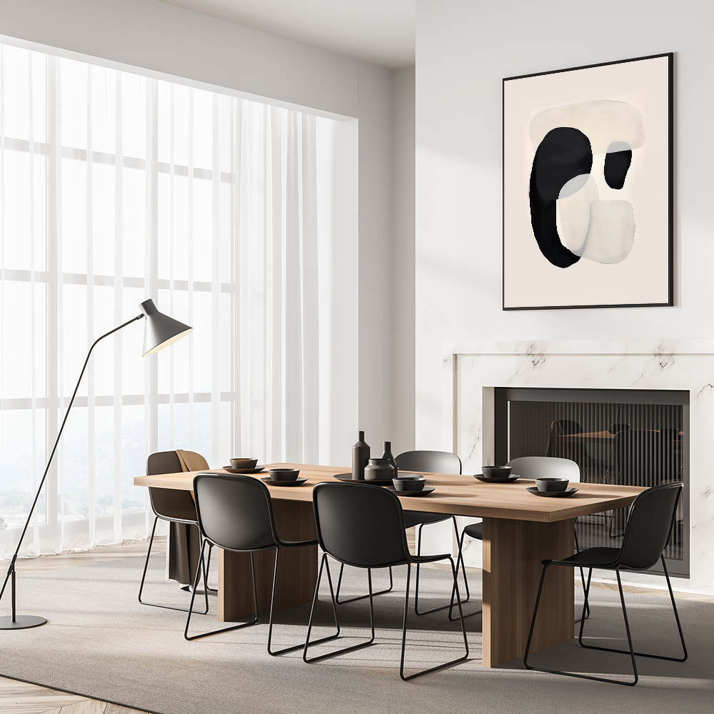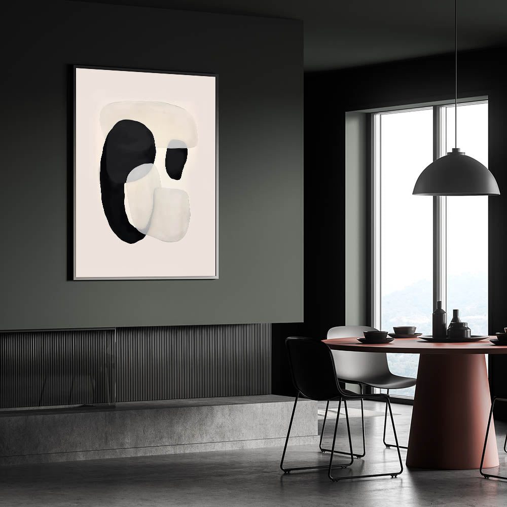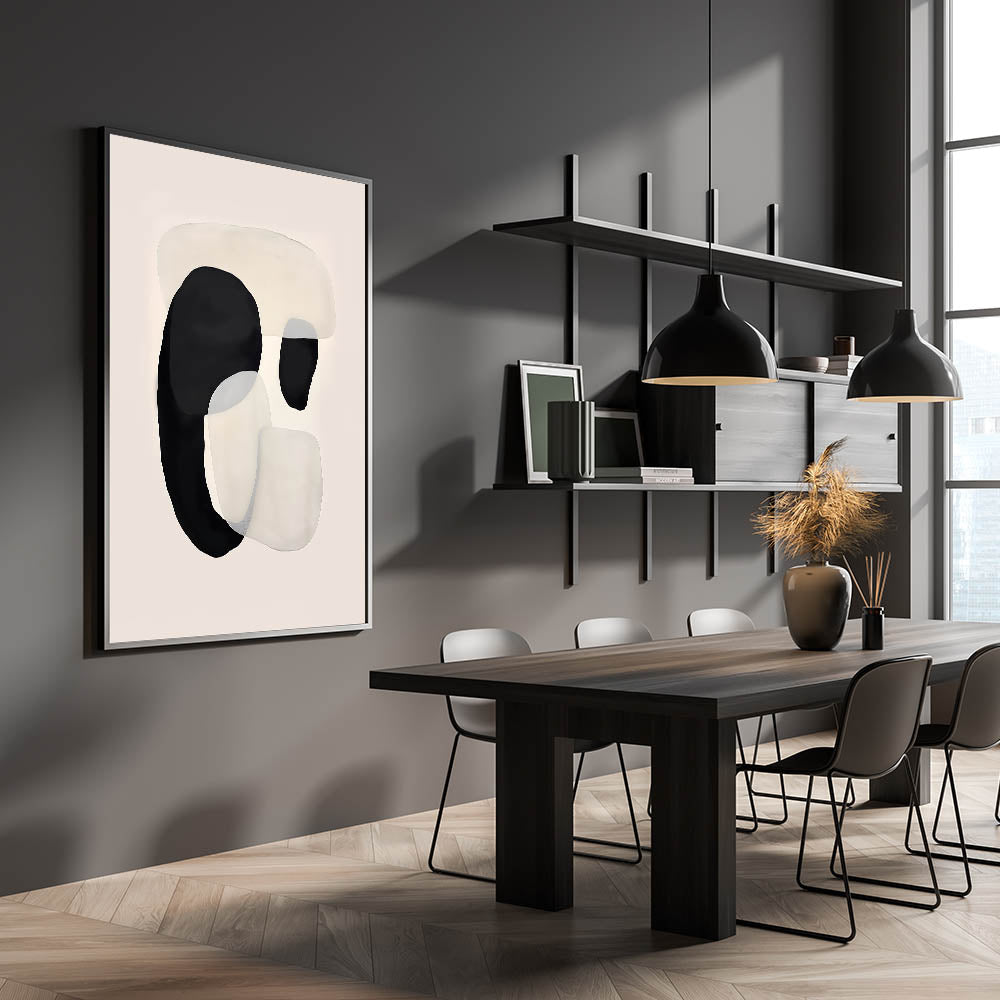 Bring a modern and elegant touch to your dining space with this canvas art for dining area, featuring an abstract black and beige composition. The fluid overlapping shapes create a sense of movement, adding a contemporary yet calming aesthetic to your home. This elegant dining room wall art is ideal for minimalist and Scandinavian-inspired interiors.