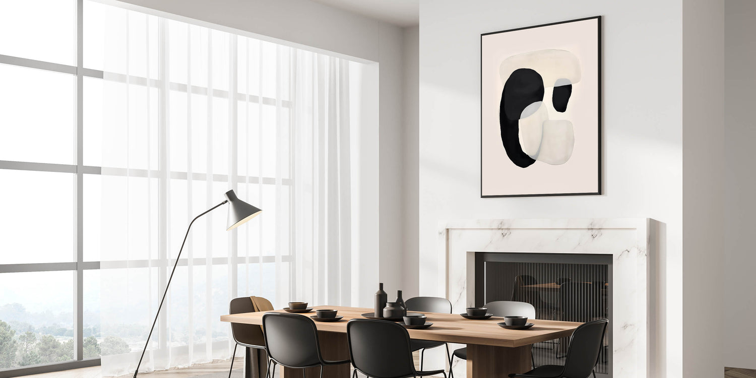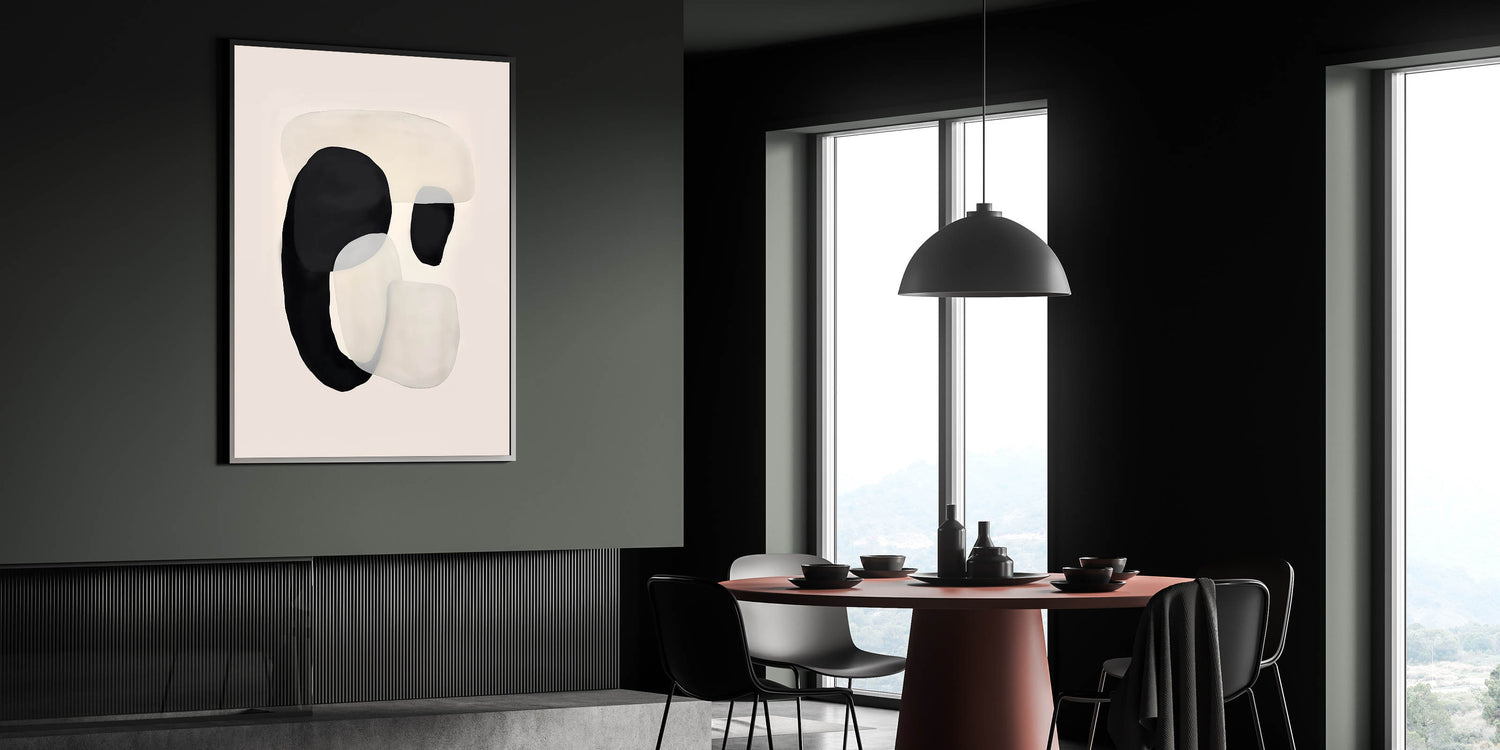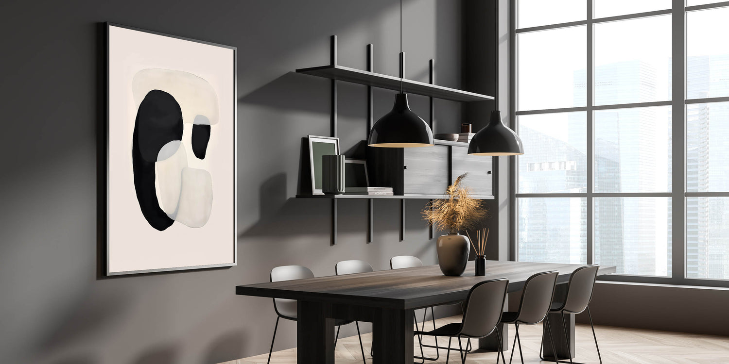 Bring a modern and elegant touch to your dining space with this canvas art for dining area, featuring an abstract black and beige composition. The fluid overlapping shapes create a sense of movement, adding a contemporary yet calming aesthetic to your home. This elegant dining room wall art is ideal for minimalist and Scandinavian-inspired interiors.