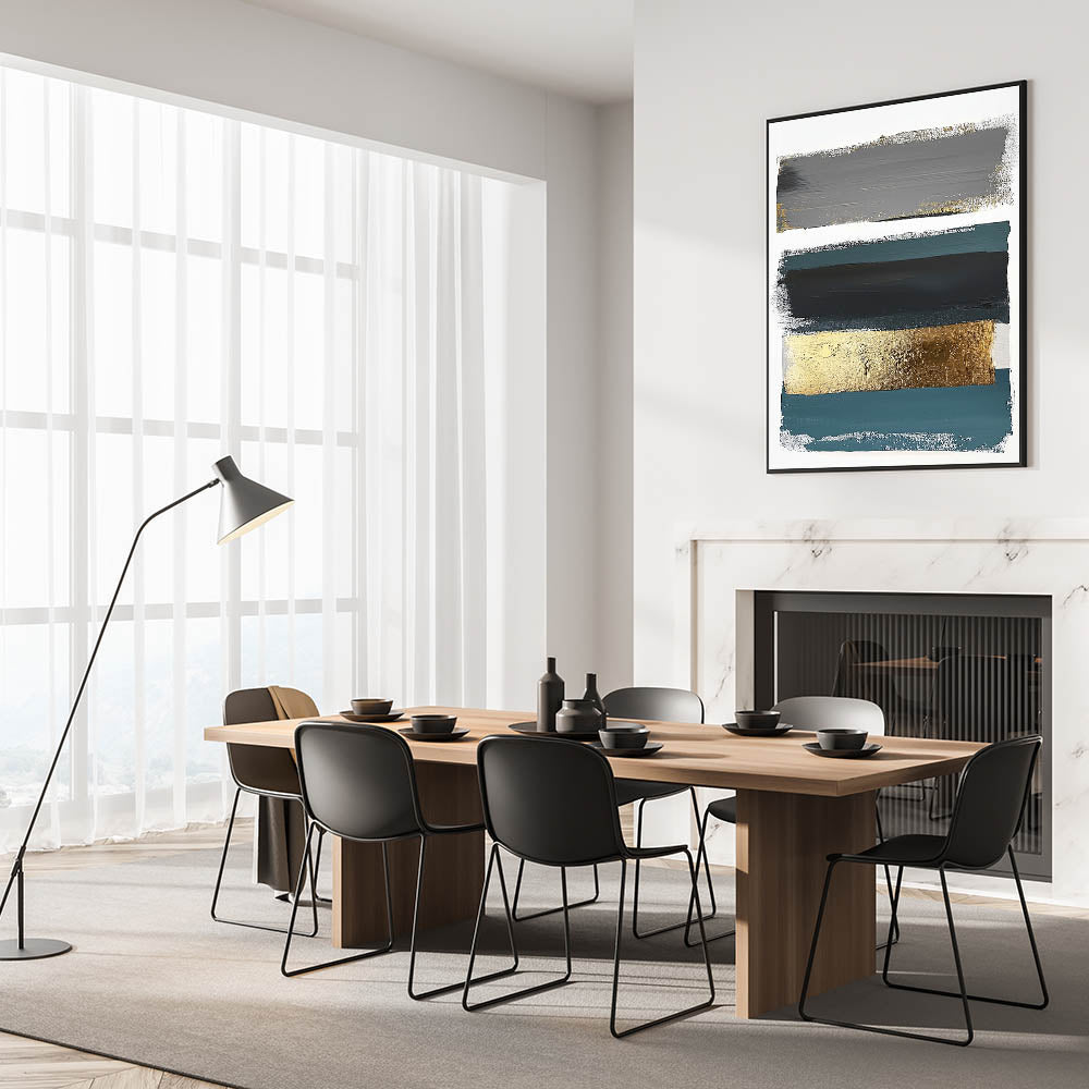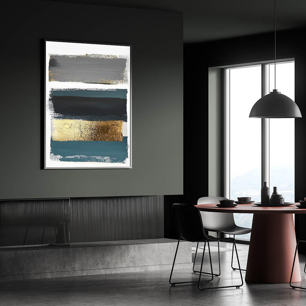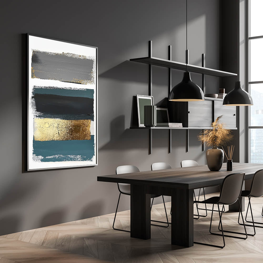 Add a refined, artistic touch to your dining space with this high-quality canvas art for dining rooms. This modern abstract piece features bold brushstrokes in deep teal, gray, black, and shimmering gold accents. Its rich color contrast and textured finish make it a striking focal point for any contemporary dining art piece collection.