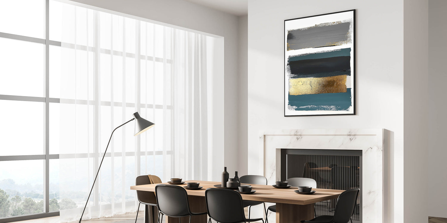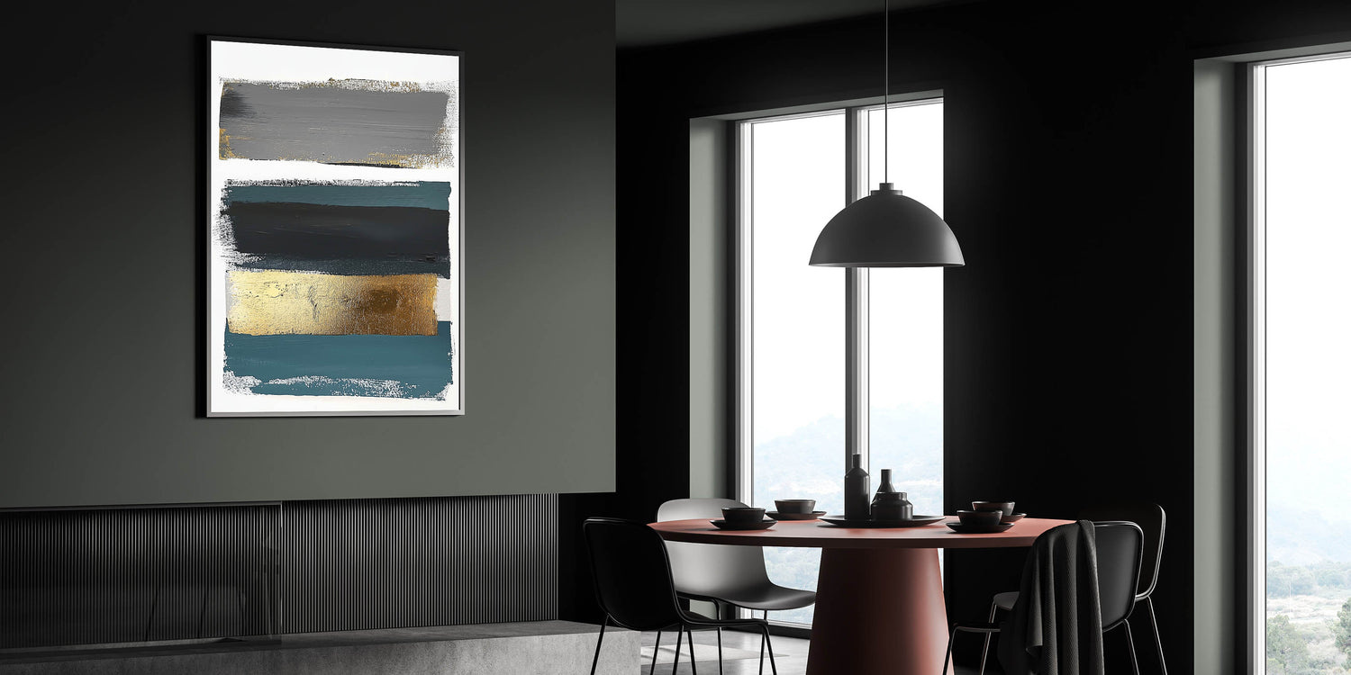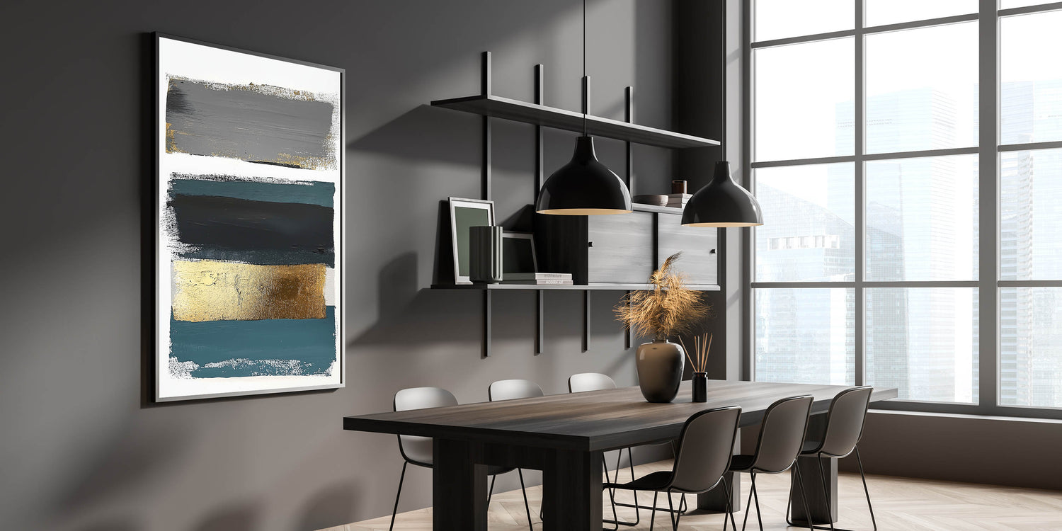 Add a refined, artistic touch to your dining space with this high-quality canvas art for dining rooms. This modern abstract piece features bold brushstrokes in deep teal, gray, black, and shimmering gold accents. Its rich color contrast and textured finish make it a striking focal point for any contemporary dining art piece collection.