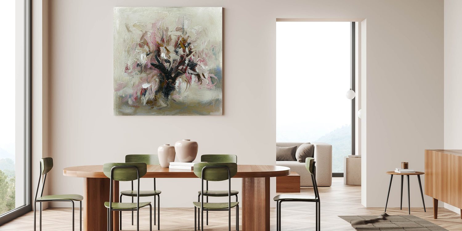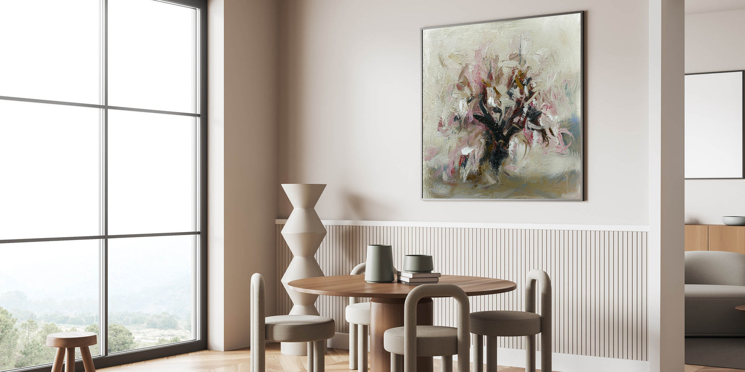 - A unique abstract floral design that complements elegant dining room wall decor.