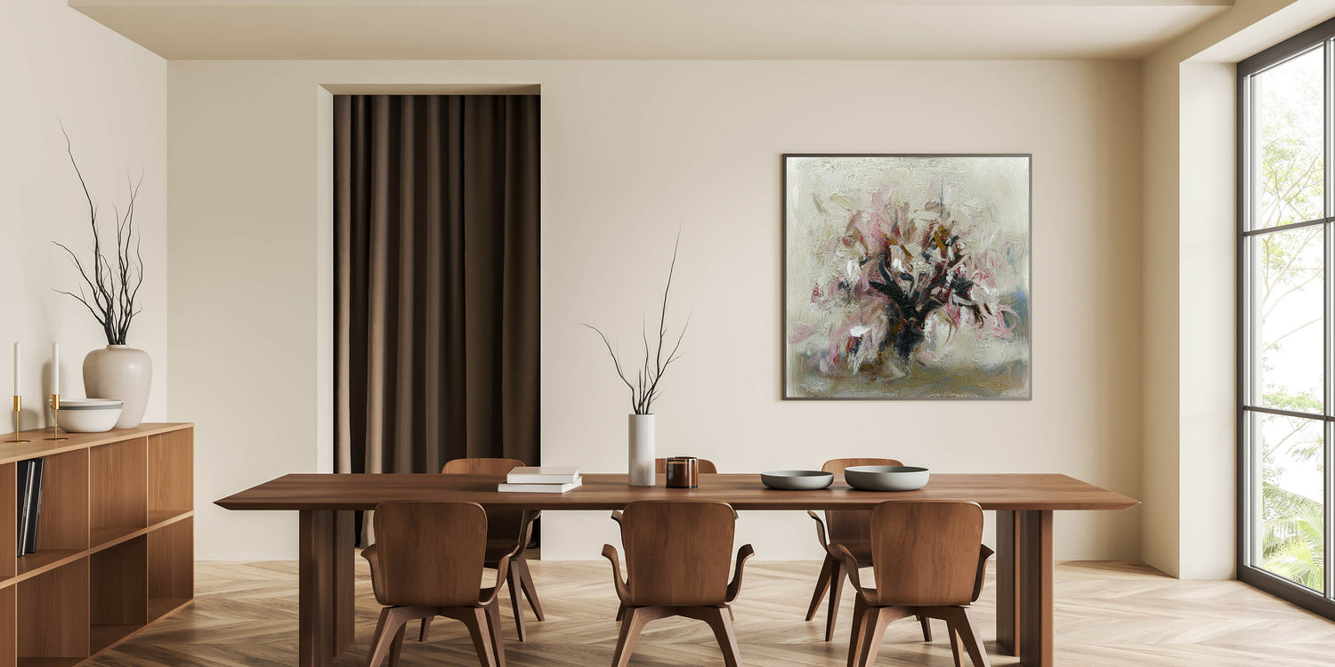Add a touch of timeless elegance to your dining space with this canvas art for dining areas, featuring a beautifully textured floral arrangement. The expressive brushstrokes in beige, brown, and blush pink tones create a delicate yet captivating composition, making it an ideal piece for sophisticated interiors. Whether displayed as framed dining room prints, acrylic dining room artwork, or premium rolled canvas prints, this artwork enhances any dining setting with warmth and refinement.