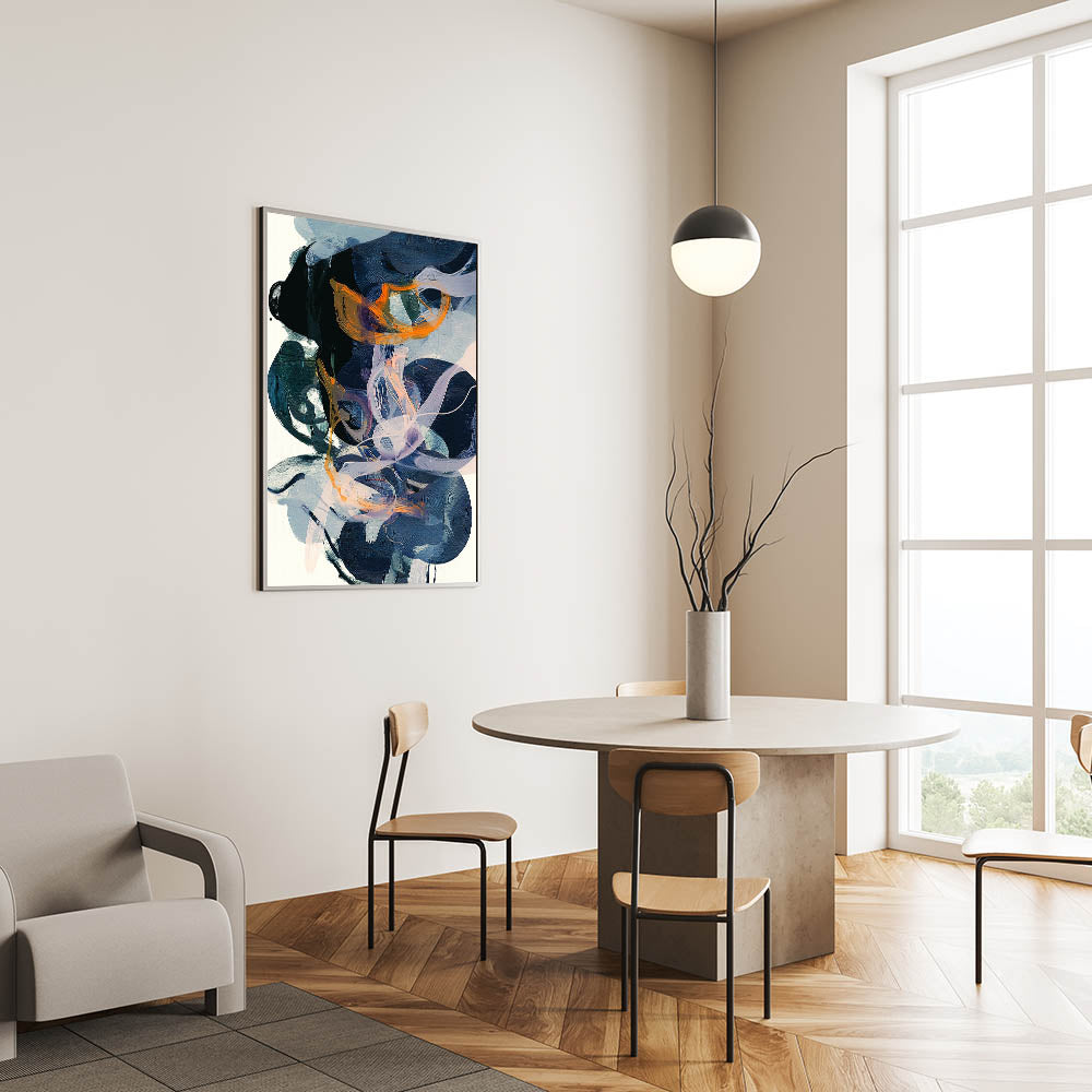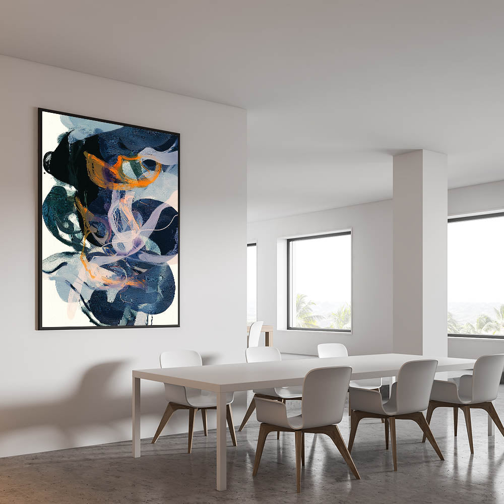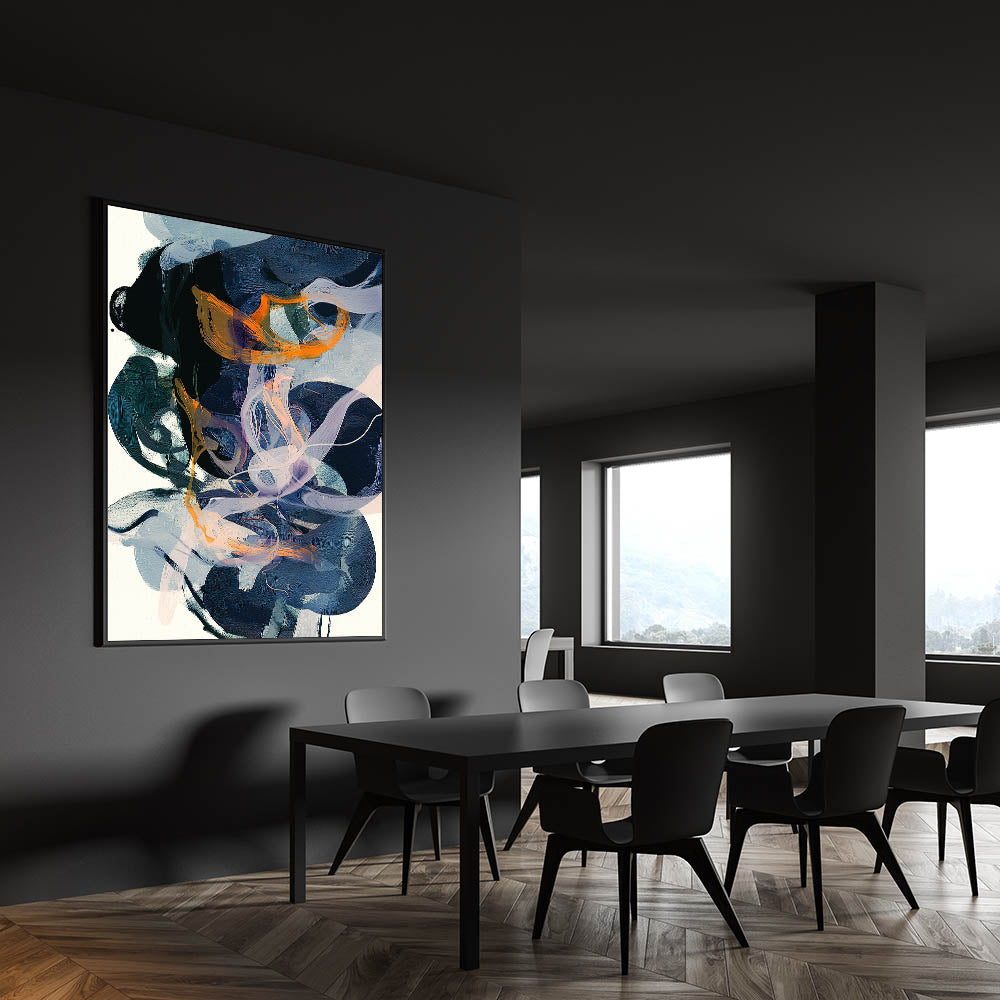 Enhance your dining space with this high-quality canvas art for dining rooms, featuring a bold abstract design with deep navy, rich teal, and striking orange hues. This contemporary artwork blends fluid brushstrokes with dynamic color contrasts, creating a stunning focal point in any dining area. Ideal for modern, eclectic, or artistic interior designs, this piece adds energy and sophistication to your space.
