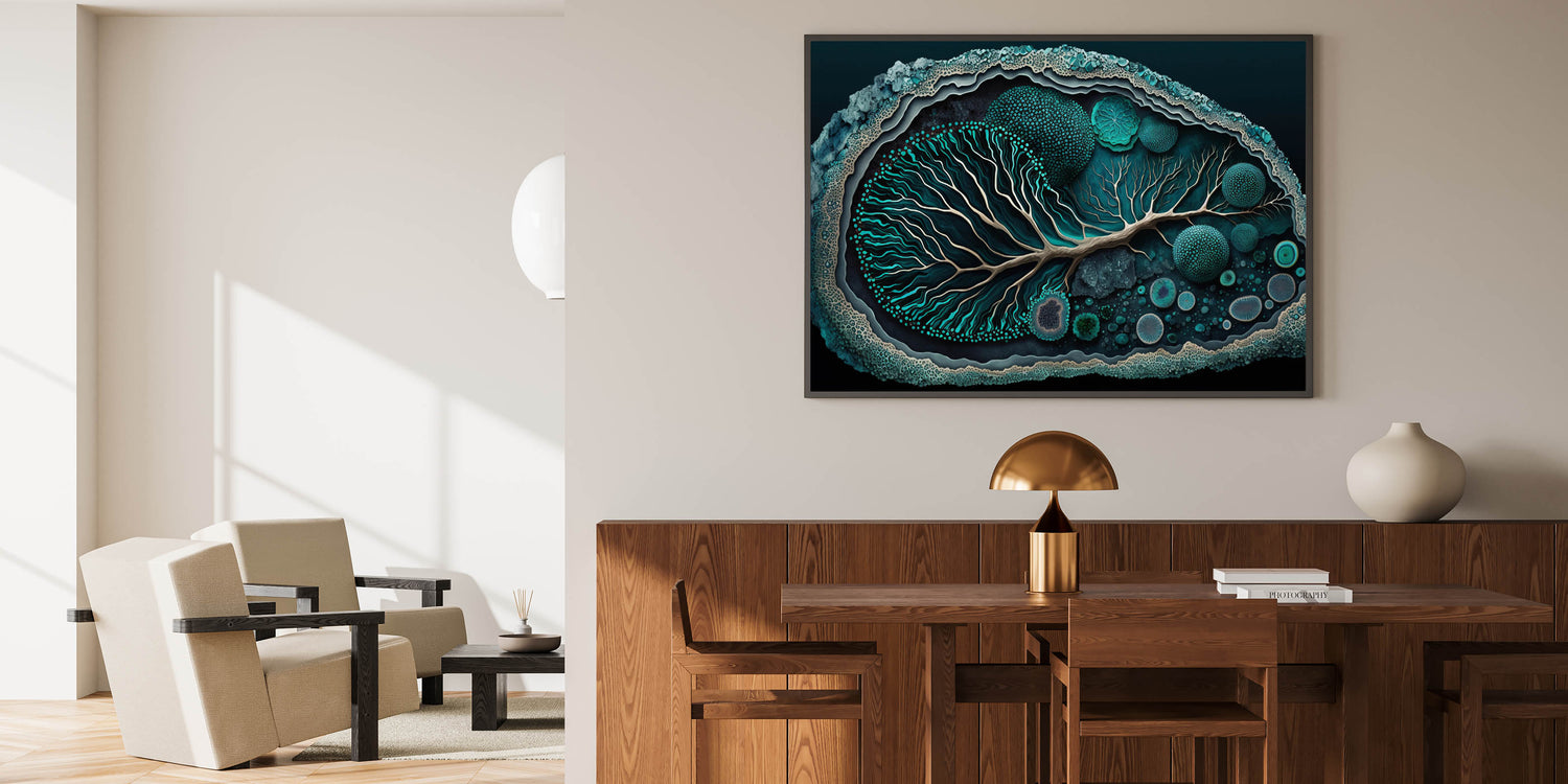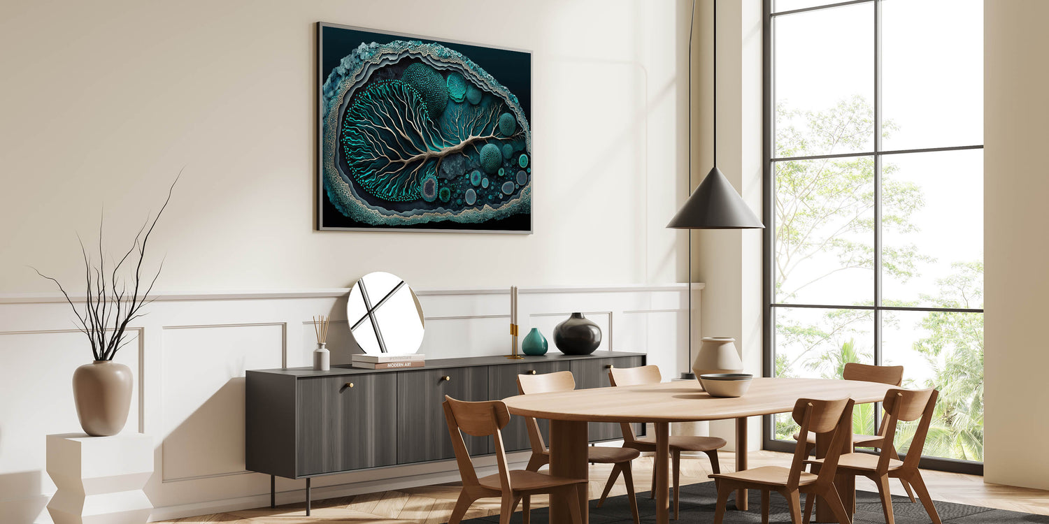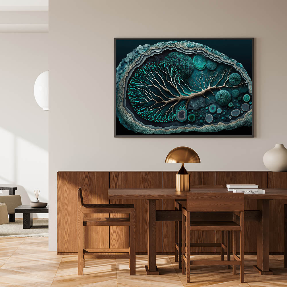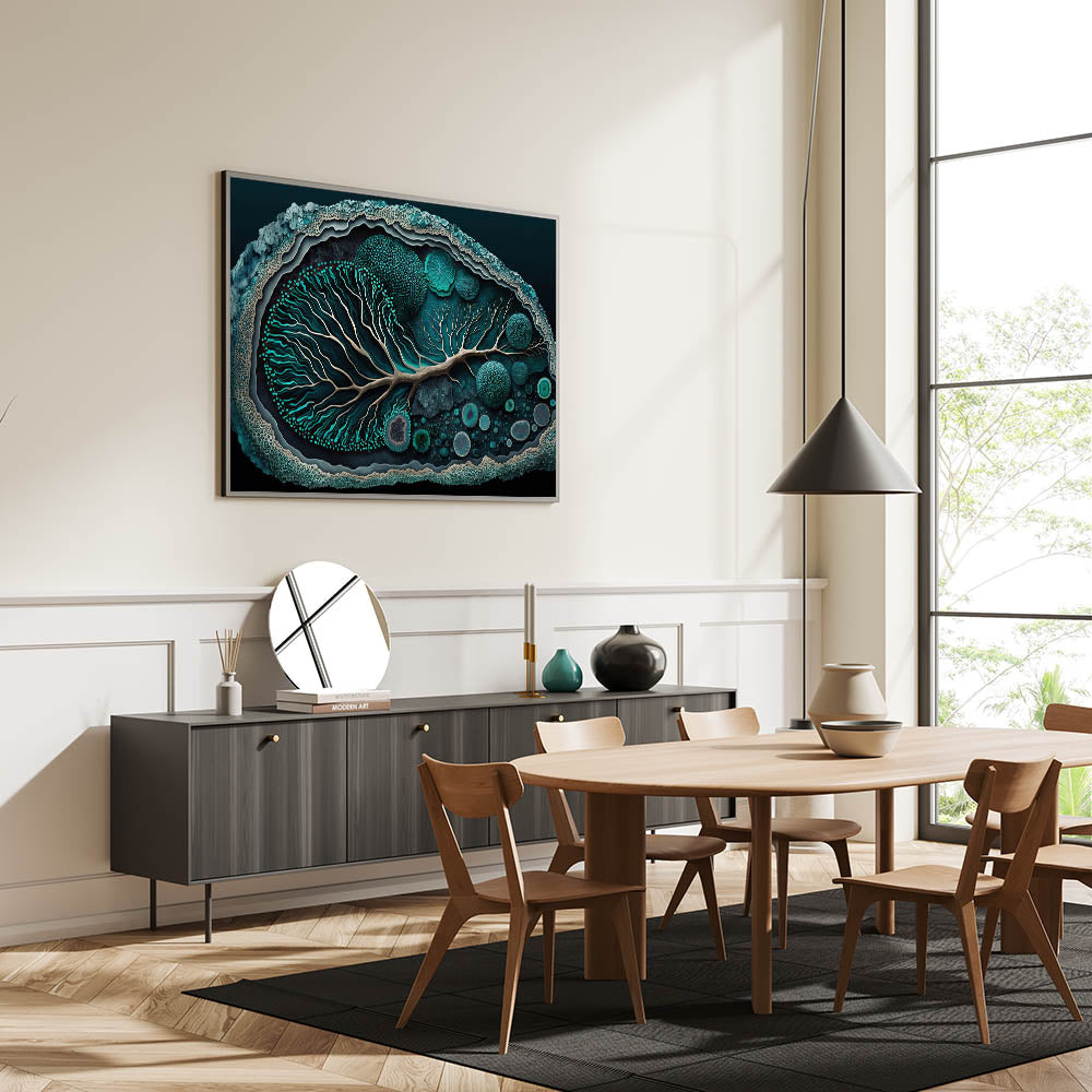 Enhance your dining area with this canvas art for dining area, featuring a breathtaking abstract geode design with intricate tree formations. The fusion of organic patterns, deep teal hues, and intricate detailing creates a visually stunning piece that blends modern sophistication with natural elements. Perfect for those seeking a contemporary yet timeless look in their dining space.