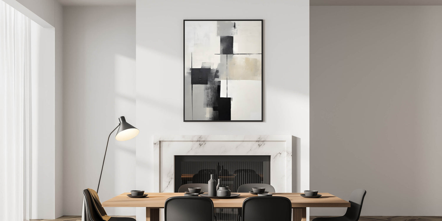 Enhance your dining space with this contemporary art for dining room walls, featuring a bold black, gray, and white geometric abstract design. The interplay of structured lines and fluid brushstrokes creates a dynamic yet minimalist aesthetic, making it a versatile addition to modern interiors. Its neutral tones and balanced composition blend seamlessly with industrial, minimalist, and contemporary décor styles.