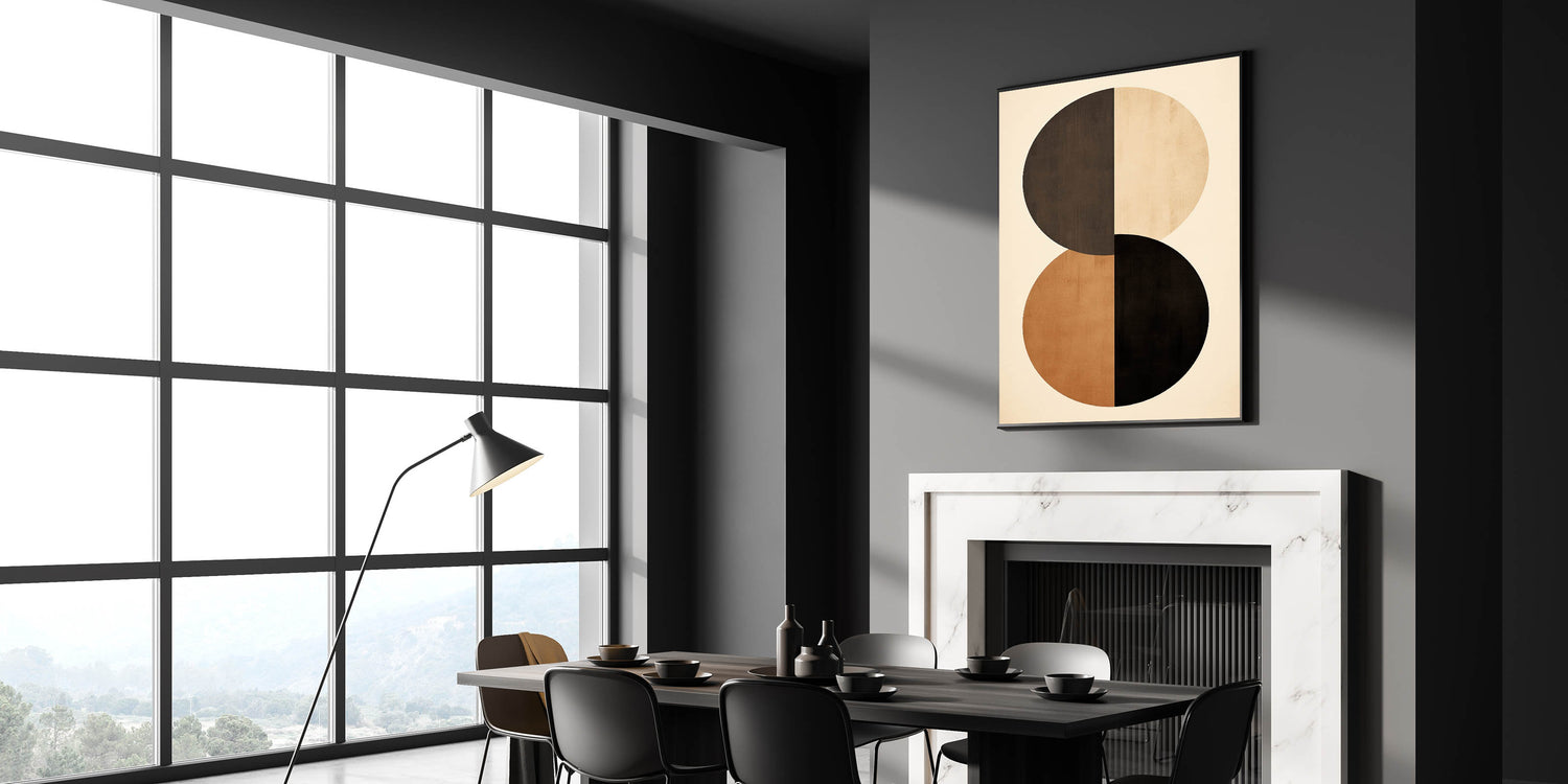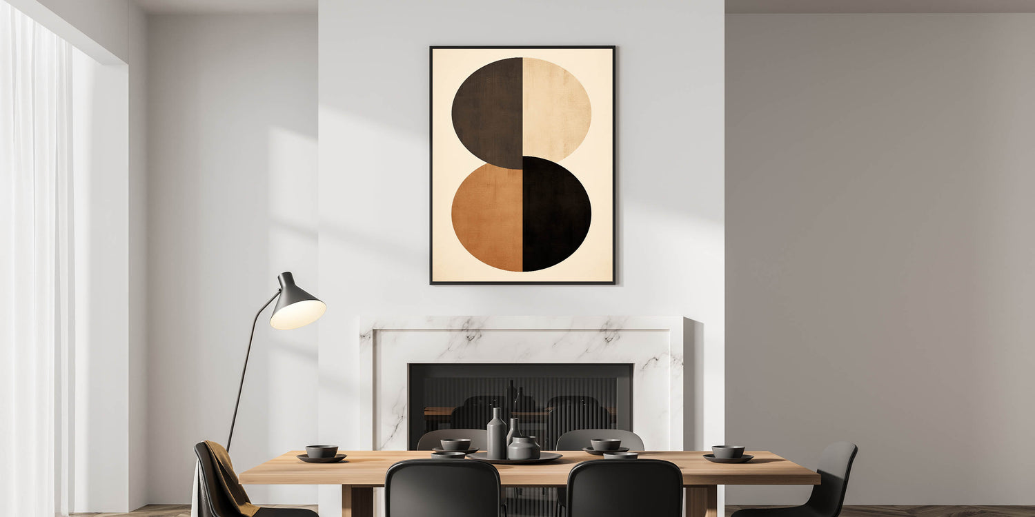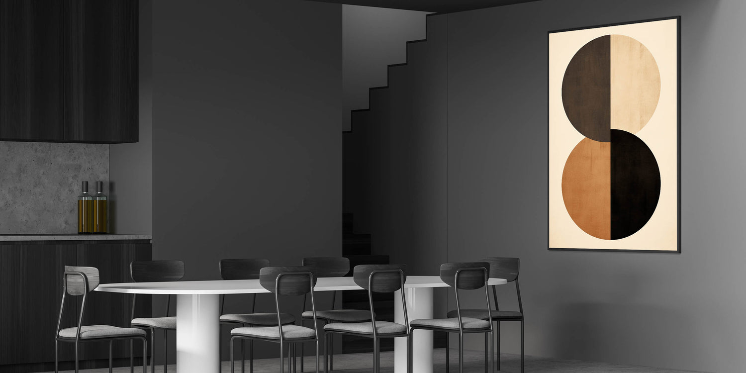 Transform your dining space with this contemporary dining art piece, featuring a minimalist geometric composition in black, brown, and beige tones. The balanced circular design adds a sense of harmony and elegance, making it a perfect addition to modern dining room wall decor.