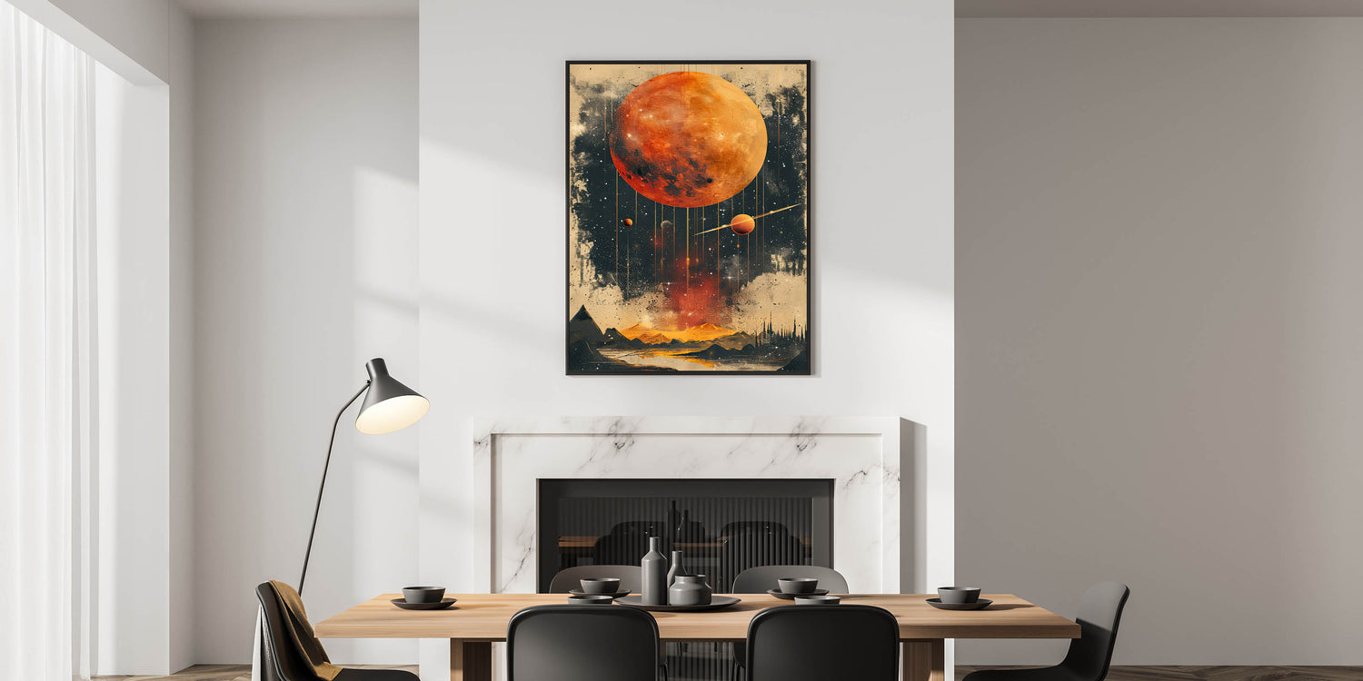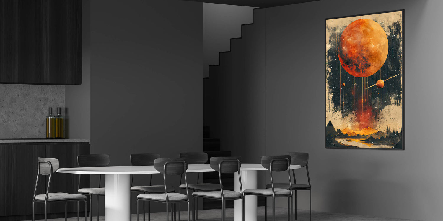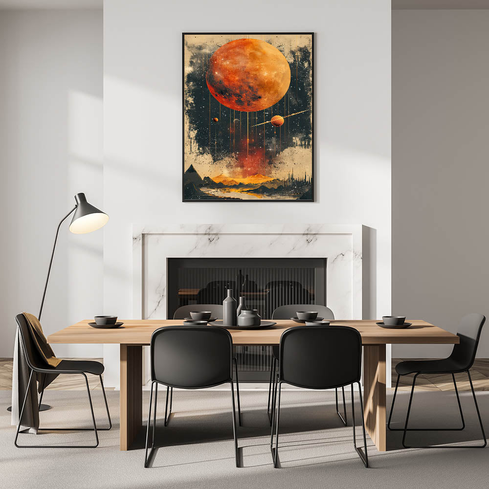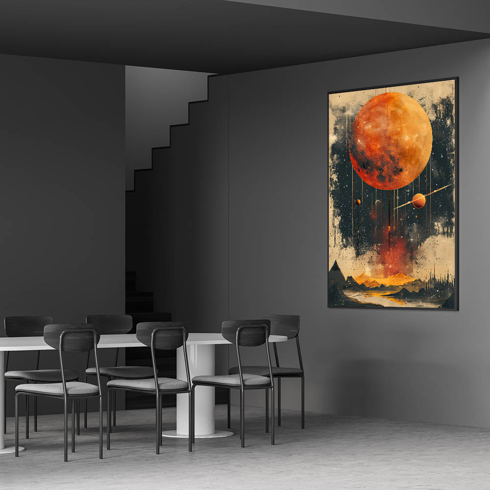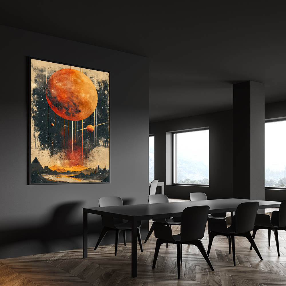 Create a sophisticated and otherworldly ambiance with this elegant dining room wall art. Ideal for contemporary interiors, it enhances your dining room wall decor with a touch of cosmic grandeur.