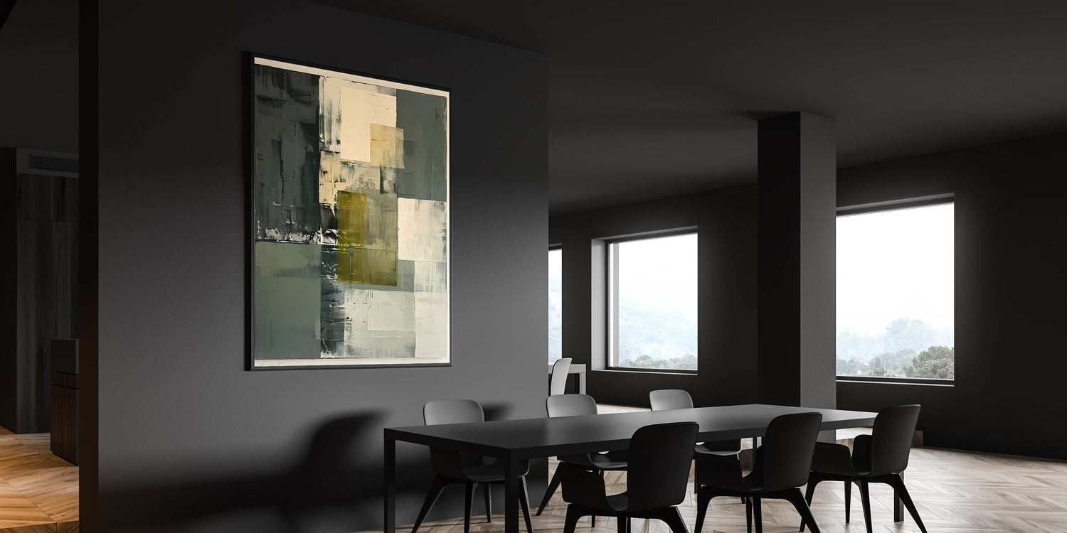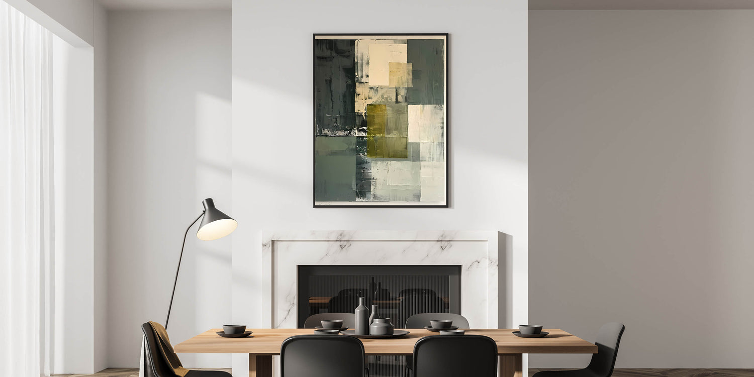 Enhance your dining space with this custom dining room wall decor, featuring a bold abstract design in rich green, gold, and beige tones. The textured composition and modern geometric elements make this a striking choice for contemporary dining art pieces. Available in high-quality canvas art for dining rooms, framed prints, and acrylic glass art for dining room walls, this piece seamlessly complements modern and rustic interiors.