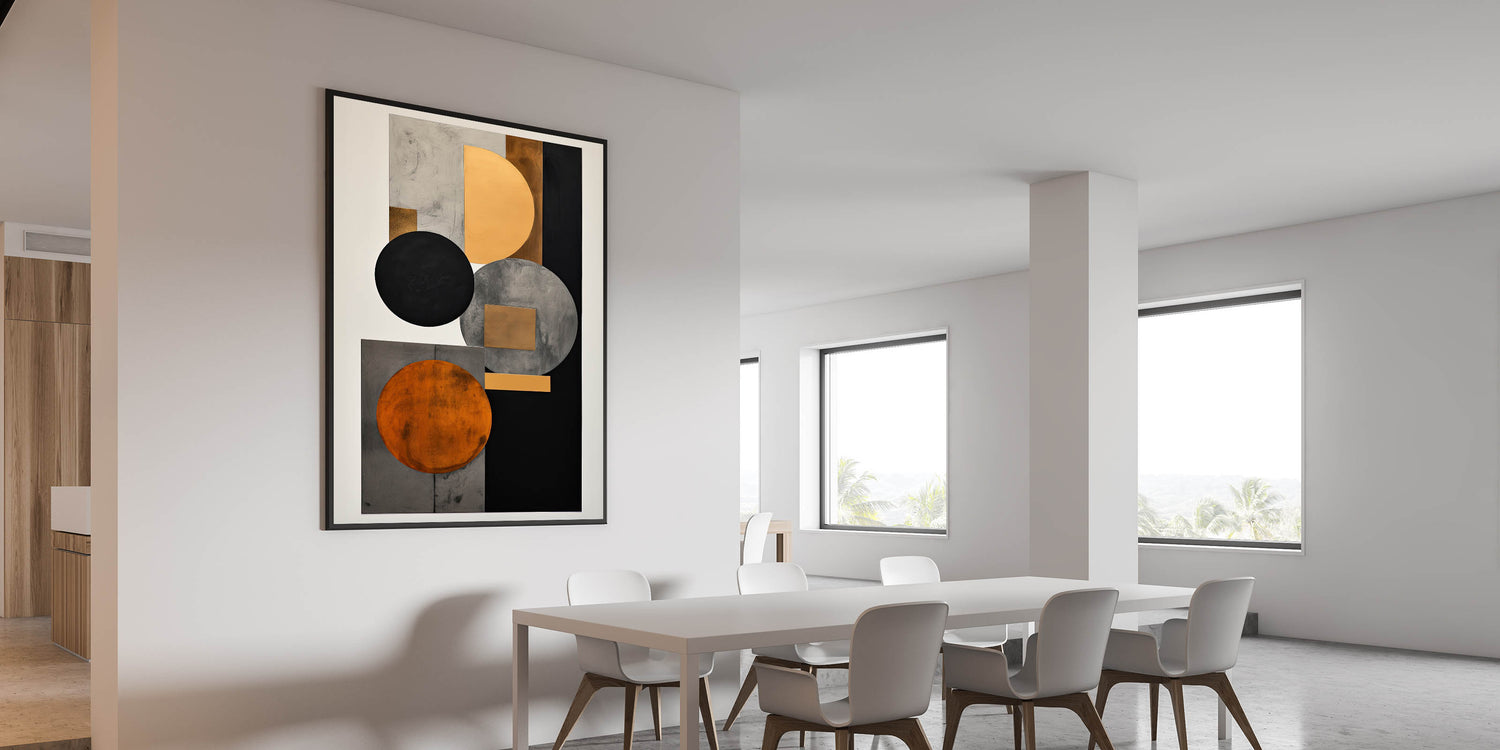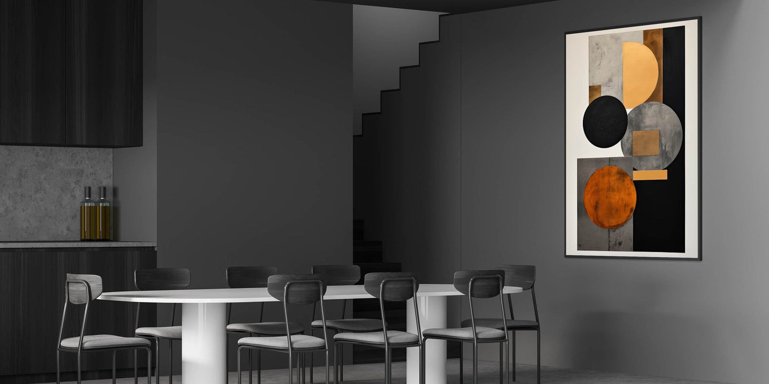 Enhance your dining space with this customizable dining area print, featuring a stunning black, gold, and gray geometric design. The combination of bold circles, sharp angles, and metallic tones creates a sophisticated visual impact, making this piece ideal for modern and luxury dining interiors. Its sleek contrast and structured layout add depth and elegance to your dining room wall décor.