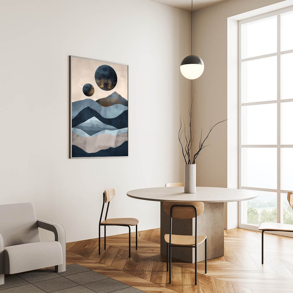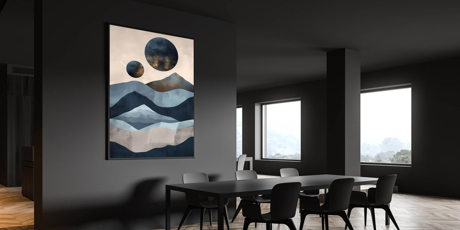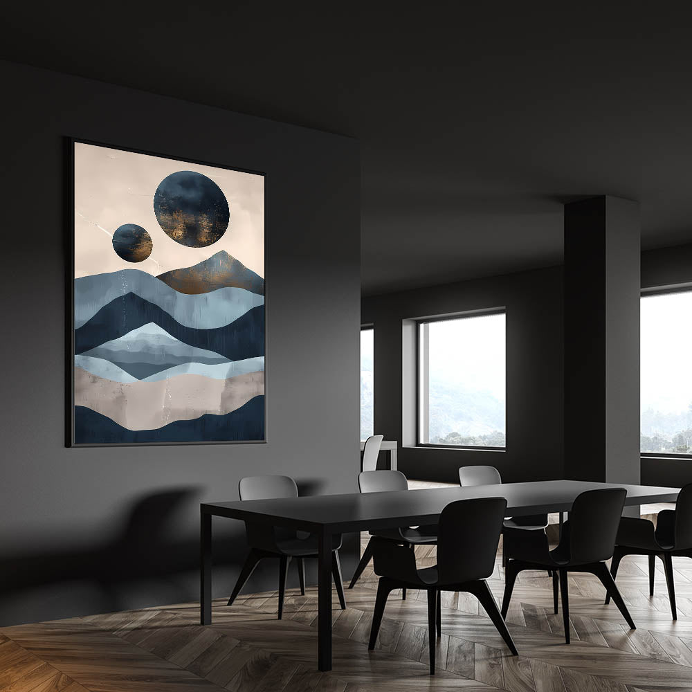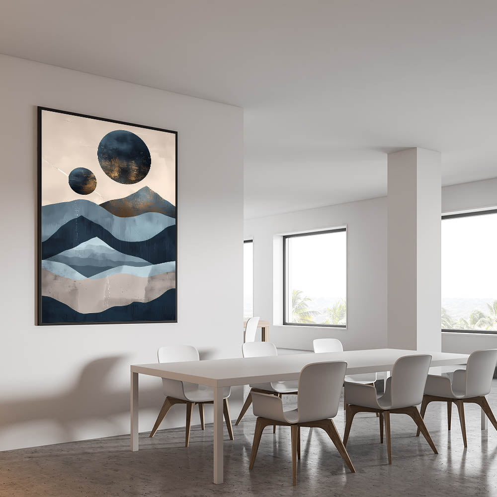 Transform your space with our dining room wall art collection, featuring a breathtaking abstract landscape in navy blue, gold, and beige. This elegant dining room wall art blends contemporary style with natural inspiration, creating a serene yet striking focal point.